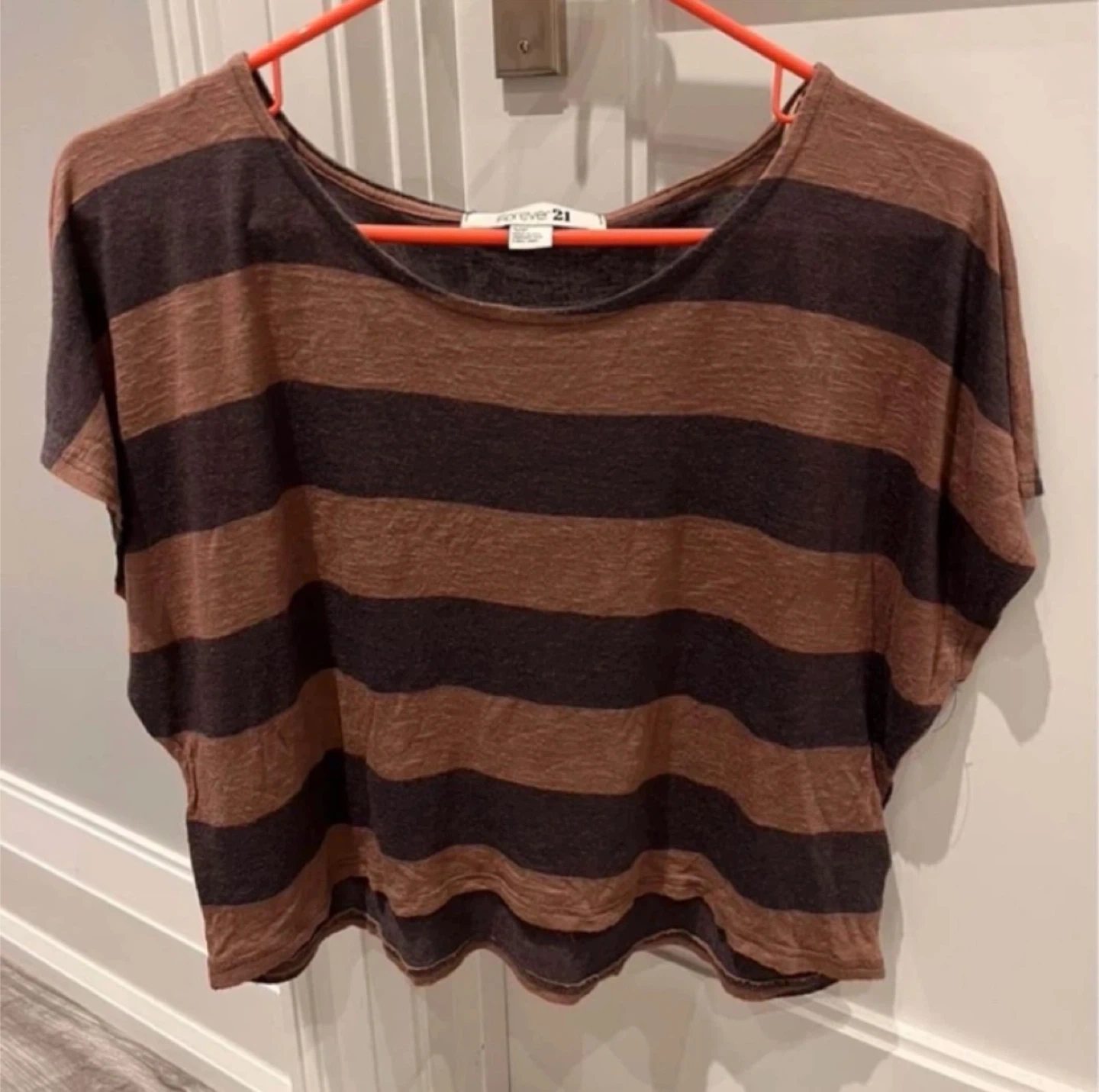 This is a Forever 21 cropped top with horizontal stripes. It features a relaxed fit and short sleeves. The material is lightweight and comfortable.