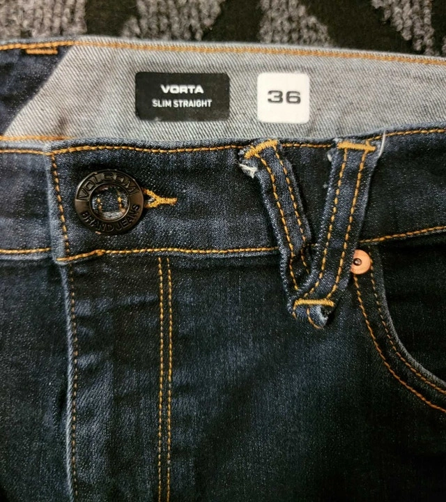 Slim straight fit, classic Volcom style. Durable denim, comfortable everyday wear. Size 36 waist. They are like brand new. Pickup in Bridgeland area.