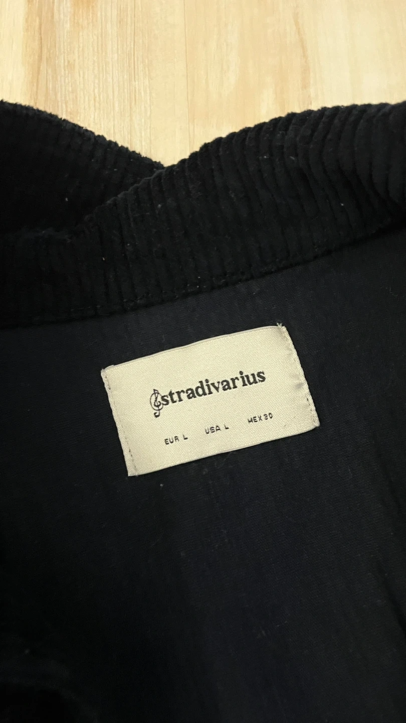 This is a black corduroy jacket from Stradivarius. It's a size Large (EUR L, USA L, MEX 30). It features a button-up front and classic collar. It's made from corduroy fabric.