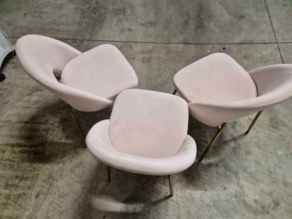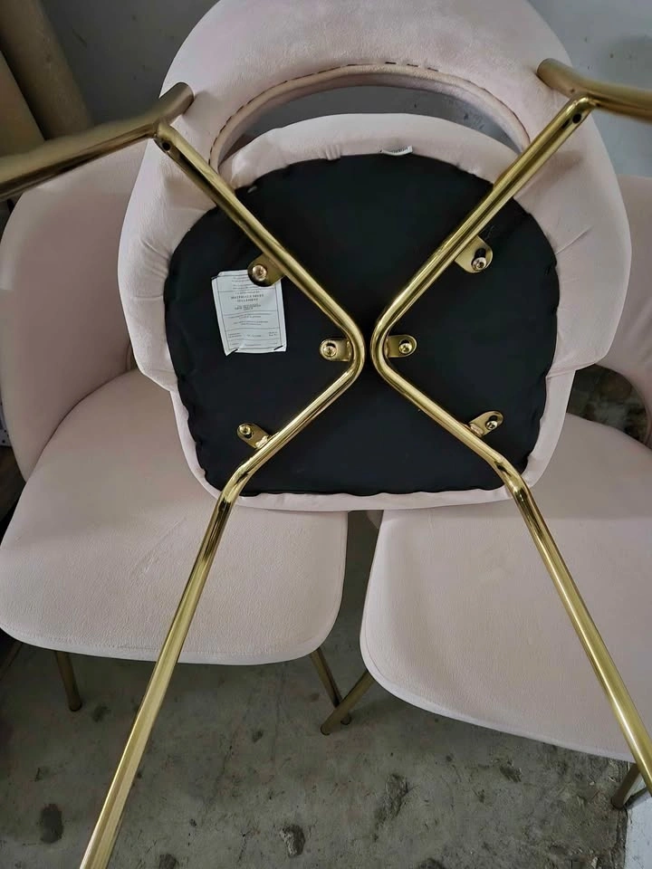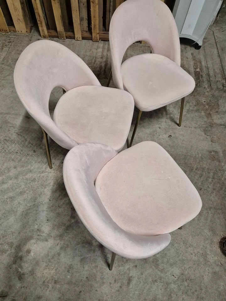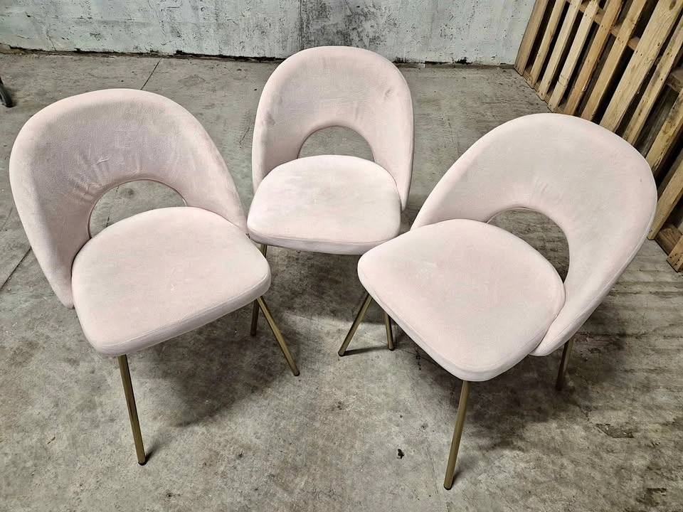 Plush pink velvet upholstery and brushed gold metal legs. Pick up only.