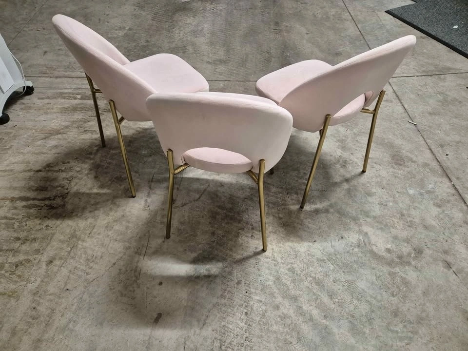 Plush pink velvet upholstery and brushed gold metal legs. Pick up only.