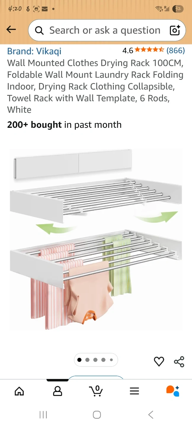 This wall-mounted clothes drying rack holds up to 60 pounds. It features thick stainless steel rods that won't sag, warp, or rust. It folds neatly against the wall when not in use, freeing up floor space. It's suitable for bathrooms, laundry rooms, or even outdoors!