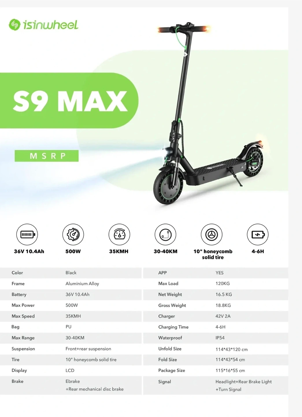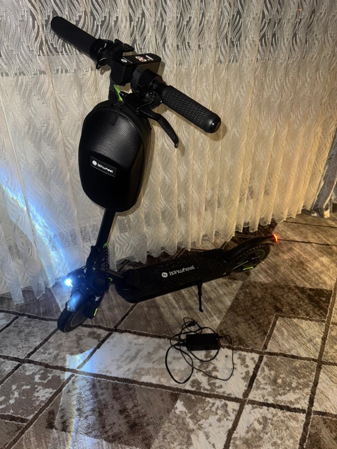 10Selling an ISINWHEEL S9 MAX Electric scooter! It's in good condition and comes with a charger and a handy bag for storage. There is a app for this scooter you can connect to your phone. Max speed is 34KM/H there is three different modes Level one, eco mode goes 14KM/H. Level two, Driver mode goes up to 29 KM/H. Level three Sport mode goes up to 34 KM/H. 500W. There is suspension. It charges 4 to 6 hours max. Max range is when it is fully charged 30-40 KM. Headlight+Rear Brake Light + Turn Signal.