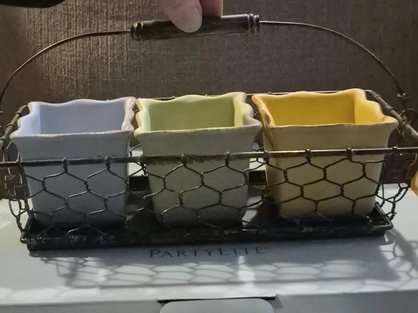 Selling a cute Partylite vintage votive set! It features three ceramic pots in pastel shades of blue, green, and yellow, all nestled in a wire basket with a handle.
