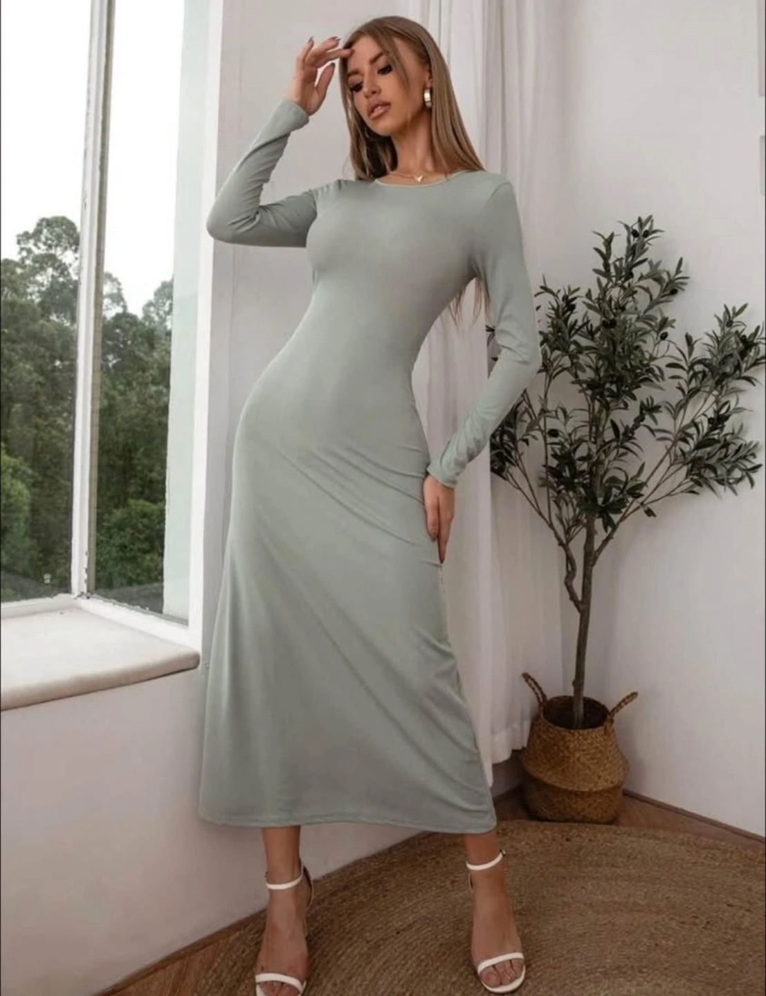 Long sleeve maxi dress. Form-fitting silhouette. Features a cutout detail at the back. Side slit. Casual, elegant style. Perfect for a night out or a special occasion.