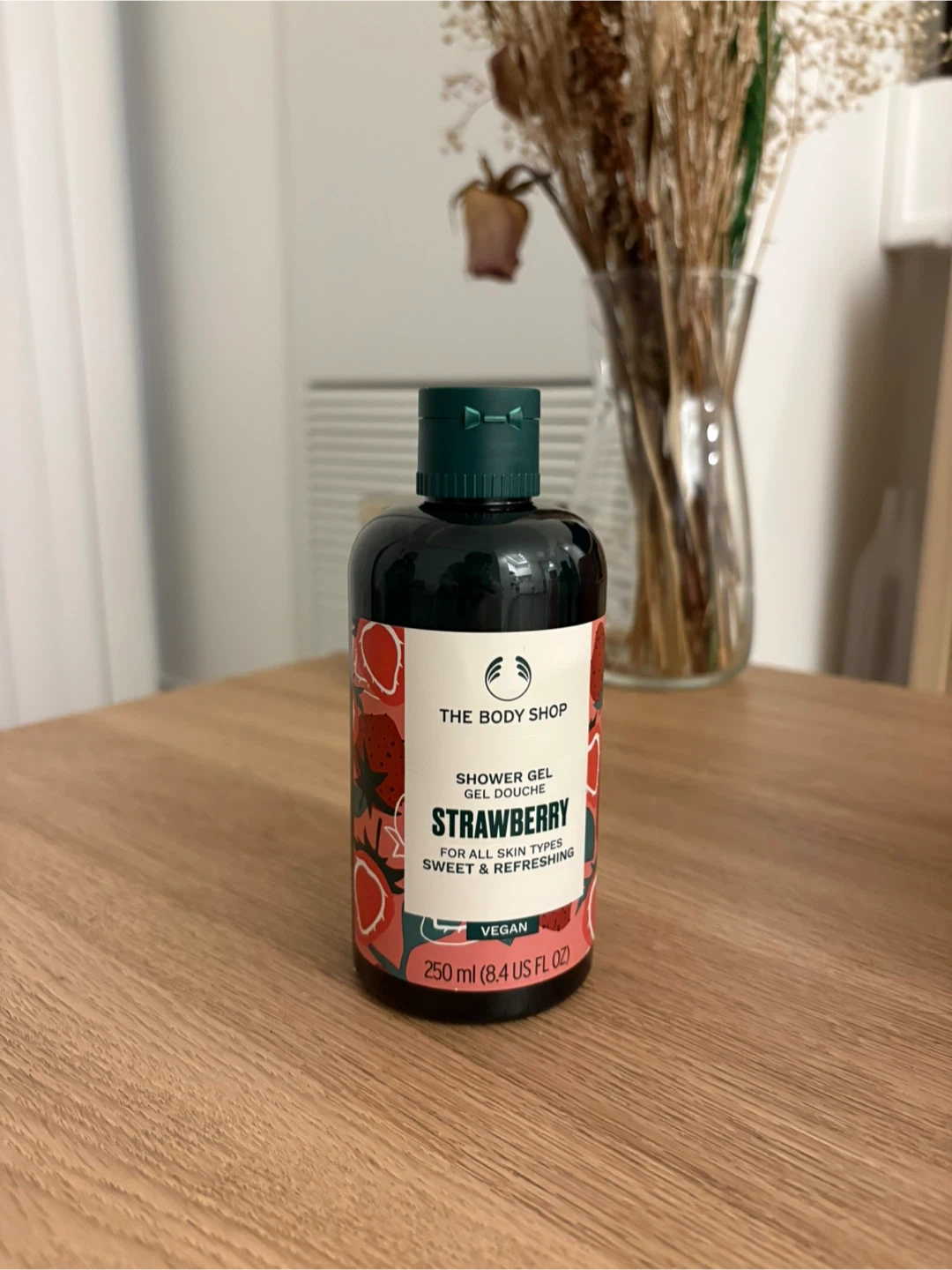 This is The Body Shop Strawberry Shower Gel. It's 250 ml and suitable for all skin types. It's vegan and leaves your skin feeling sweet and refreshed!