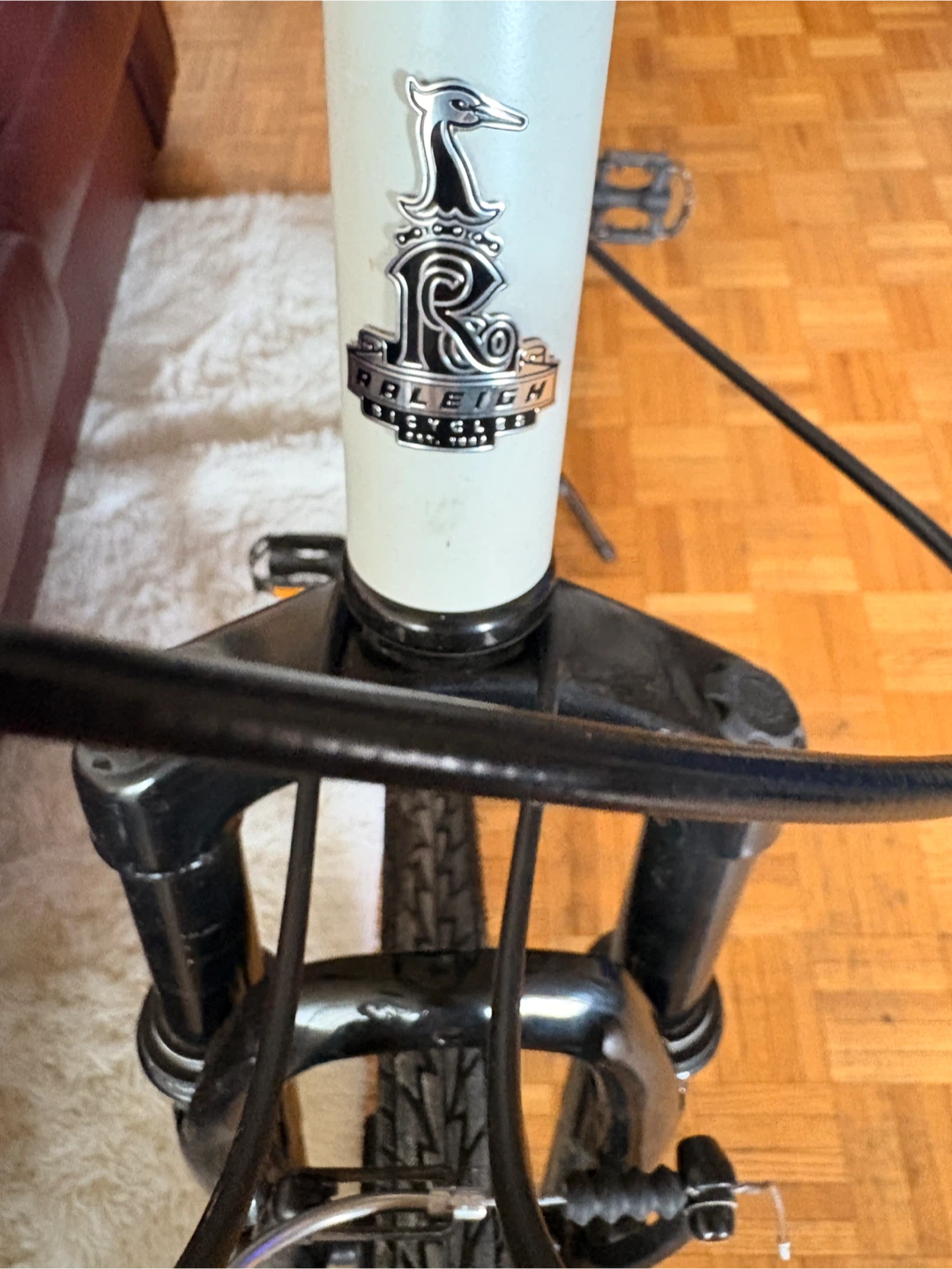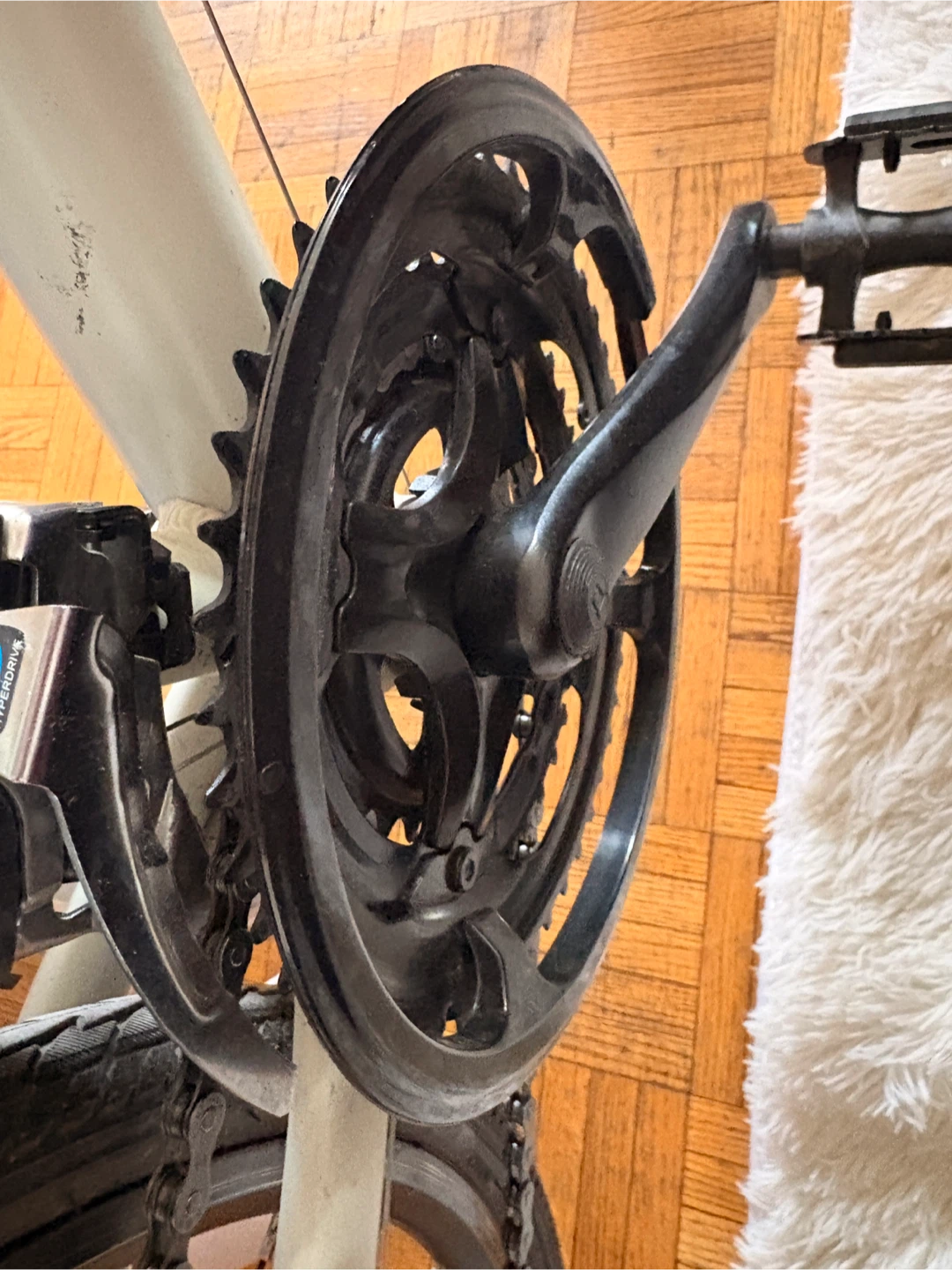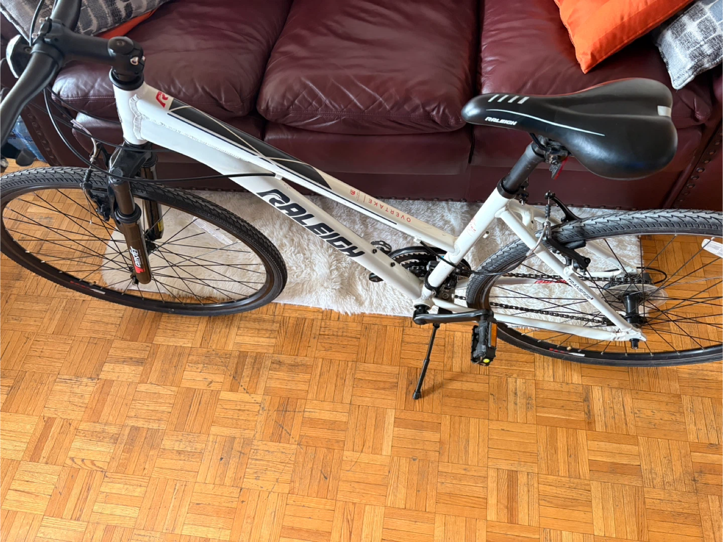 Raleigh Overtake hybrid bike in white. Aluminum alloy frame with Shimano components. Perfect for commuting or recreational riding! It has a medium size frame