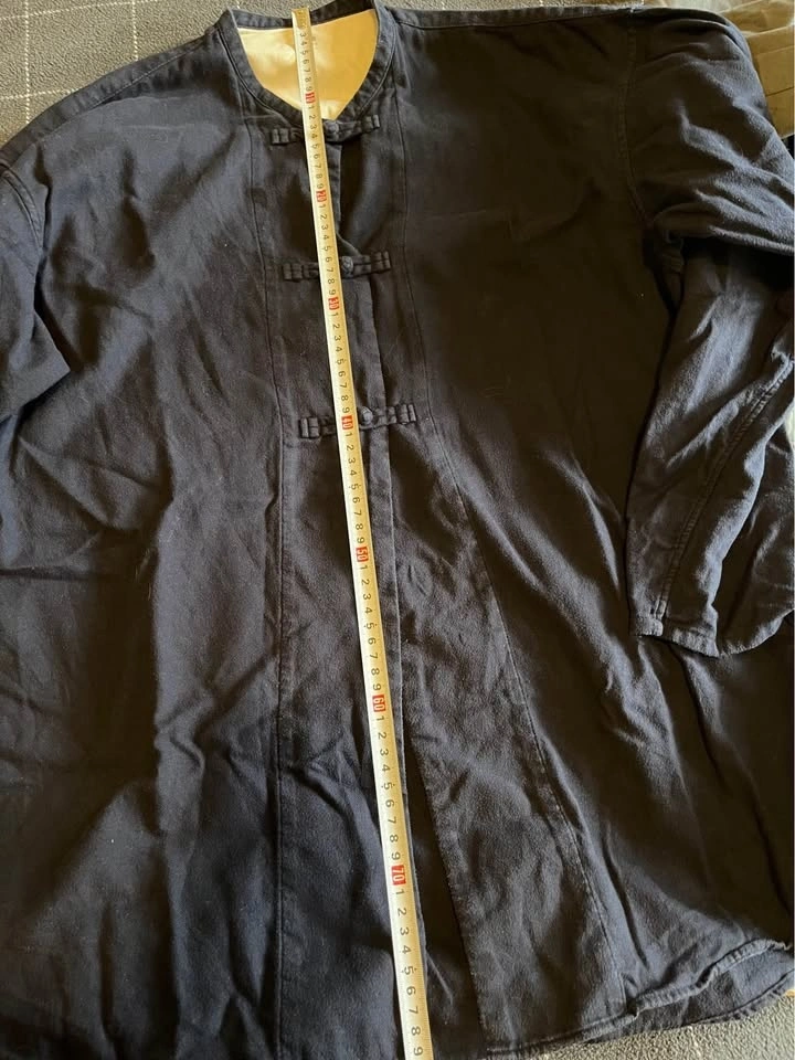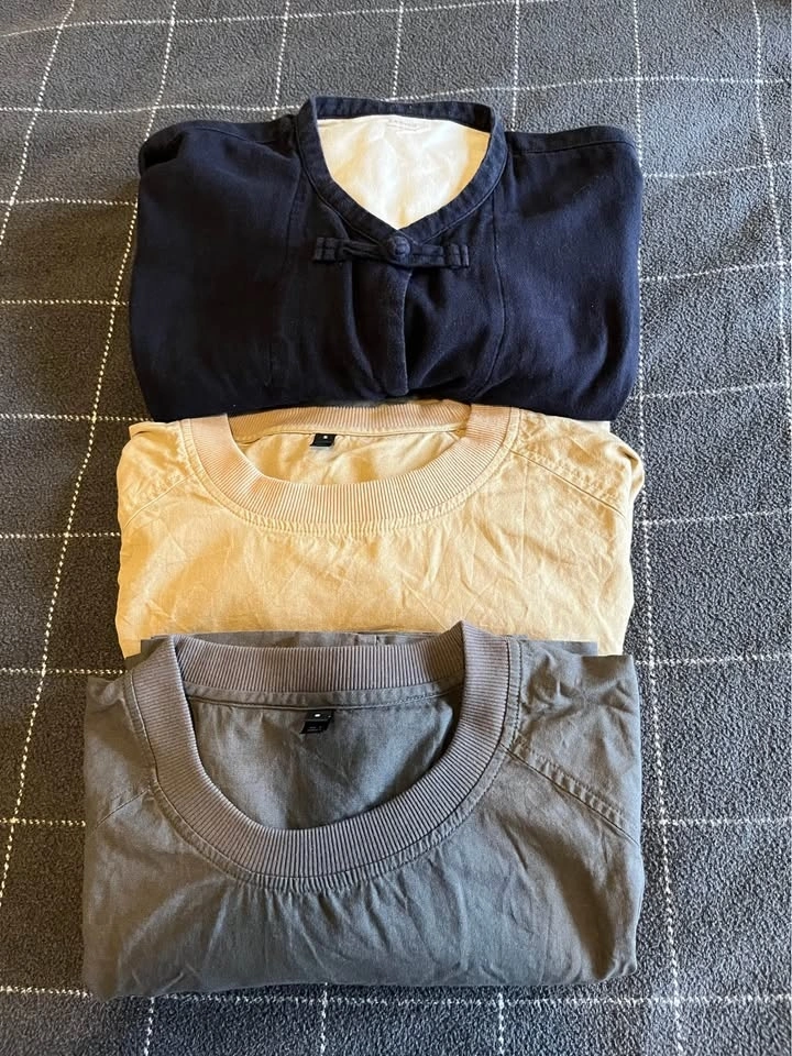 Versatile clothing bundle includes a dark blue long sleeve tunic with frog closures and a mandarin collar. Also includes two short sleeve tees, one tan and one gray. The gray tee has a ribbed crew neck and raglan sleeves. Tunic is about 70 cm long. Gray tee is about 50-51 cm wide and 70 cm long. Great for layering or just chilling.