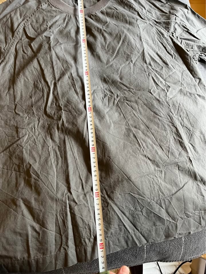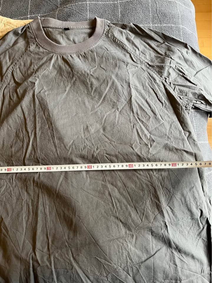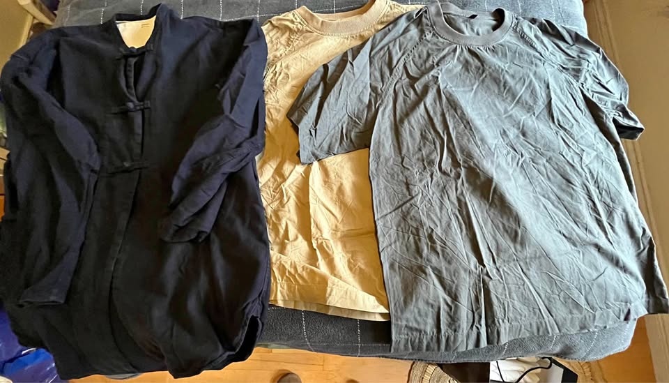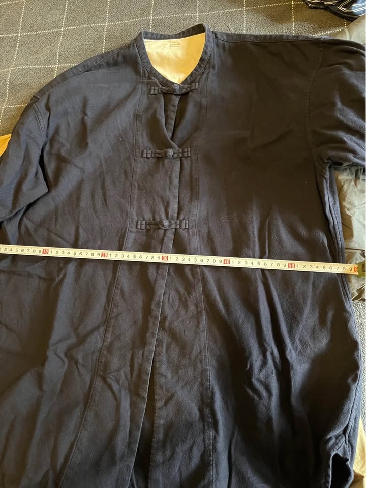 Versatile clothing bundle includes a dark blue long sleeve tunic with frog closures and a mandarin collar. Also includes two short sleeve tees, one tan and one gray. The gray tee has a ribbed crew neck and raglan sleeves. Tunic is about 70 cm long. Gray tee is about 50-51 cm wide and 70 cm long. Great for layering or just chilling.