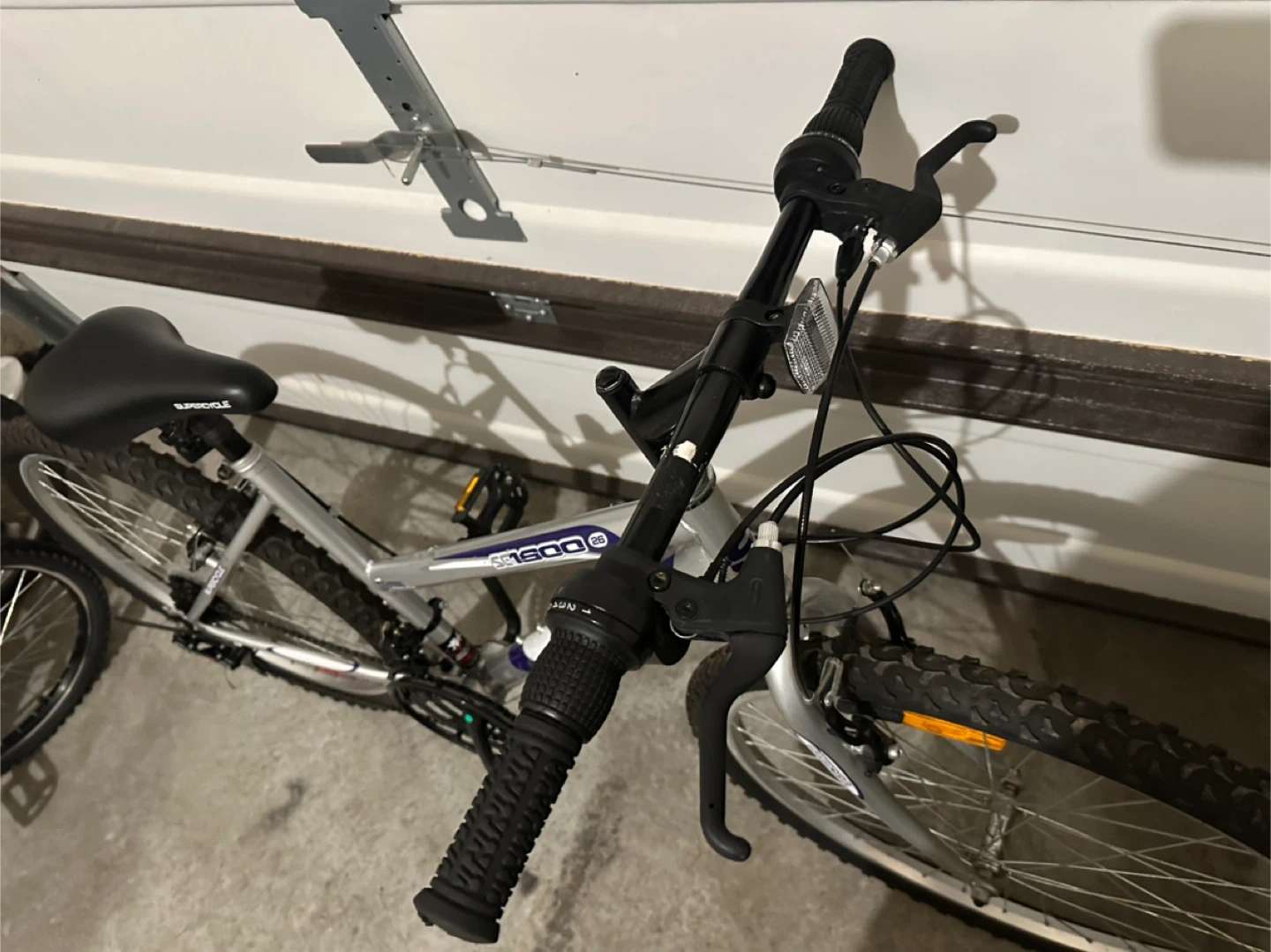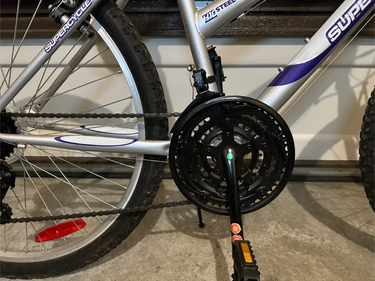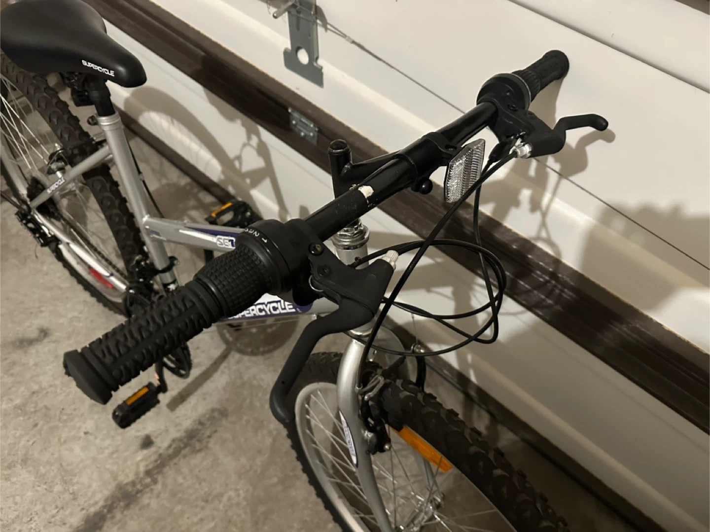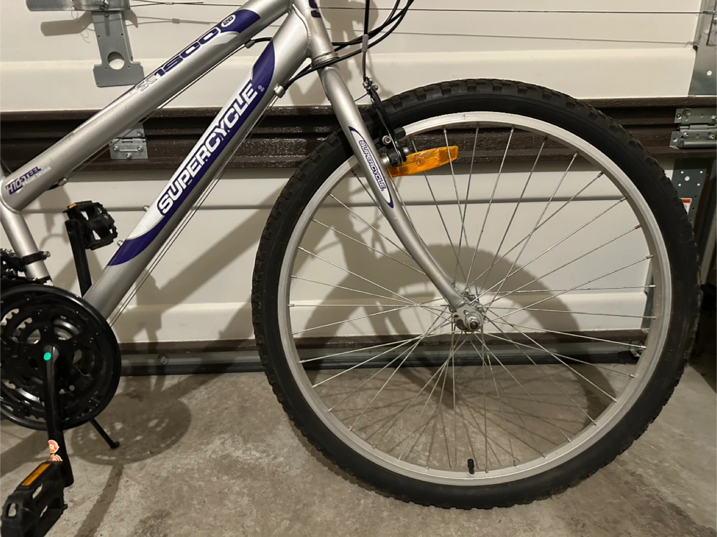 This is a silver Supercycle SC1600 mountain bike with 26-inch wheels. It features a hi-tensile steel frame and a Shimano derailleur. It's great for riding on trails or around town!