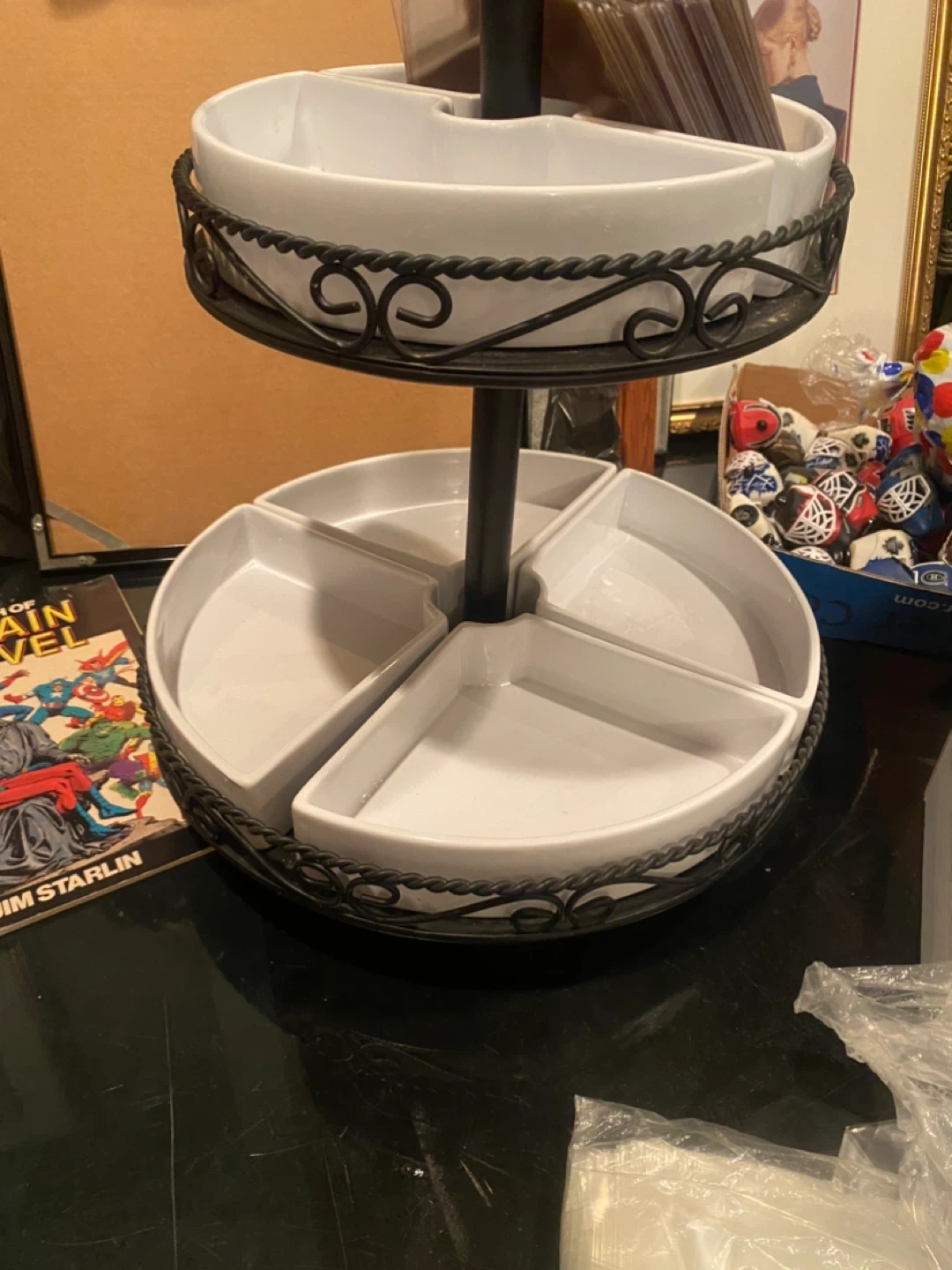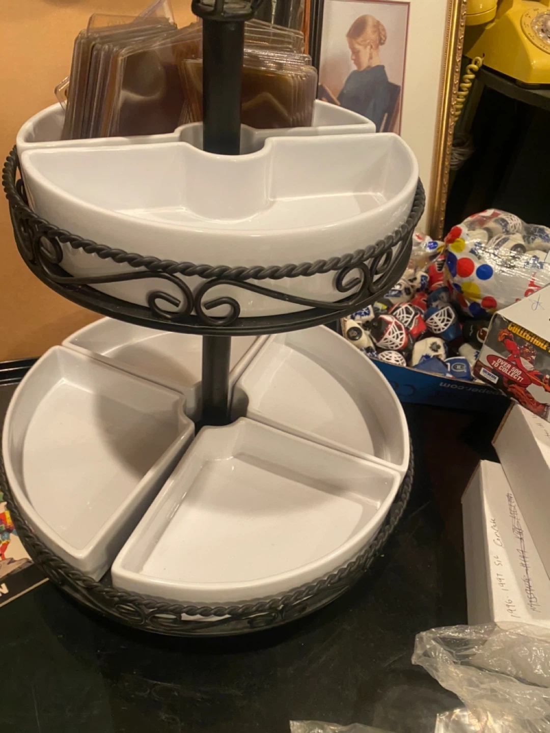 This two-tier serving tray features white ceramic dishes with ornate black metal scrollwork. It's perfect for serving appetizers, dips, or desserts at gatherings. The tiered design helps save table space while offering multiple compartments for various items.
