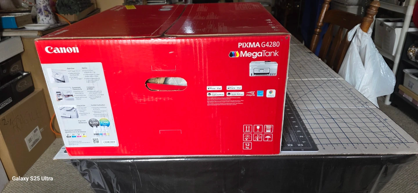 Canon PIXMA G4280 MegaTank All-In-One wireless printer. It's a compact unit with ADF functionality. Includes MegaTank ink bottles for high-volume printing. Brand new in box, never opened.