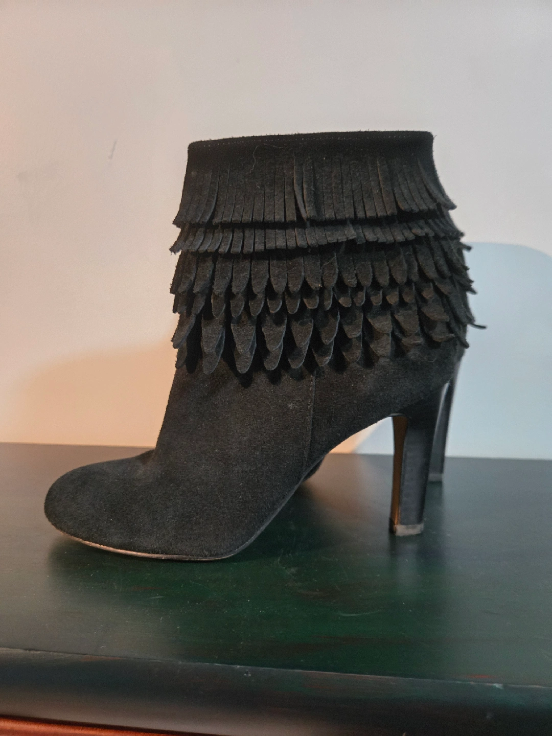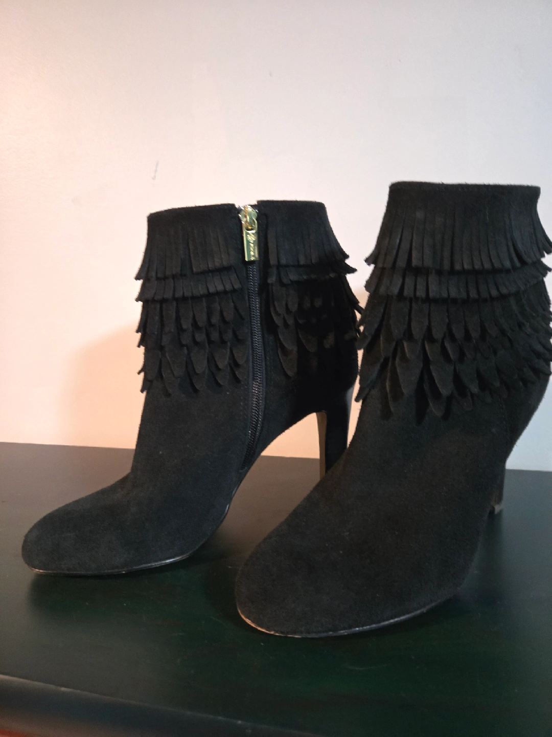 These stylish Isola booties are perfect for adding a touch of flair to any outfit! They feature a unique fringe design and are made of soft black suede. They are a women's size 8.