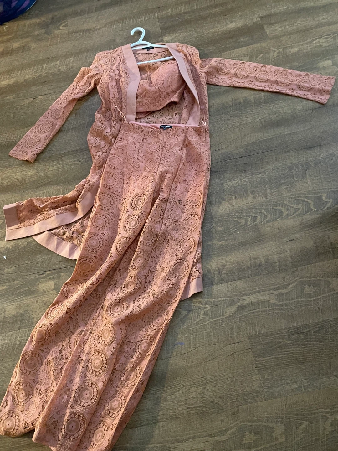 This set includes wide leg pants and a matching lace duster. The fabric is a detailed lace in a pretty pink shade. It's a stylish outfit for a night out!