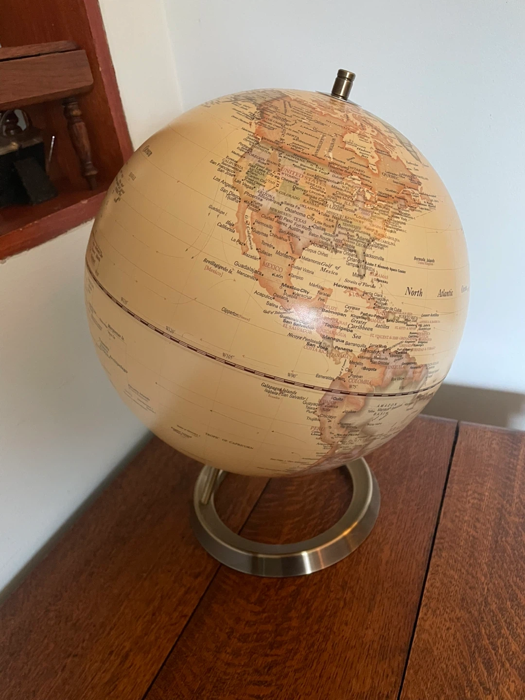 A classic world globe with a neutral colour palette. It sits on a metal stand, showing countries and major cities. The globe displays latitude and longitude lines. Great for the classroom or home!