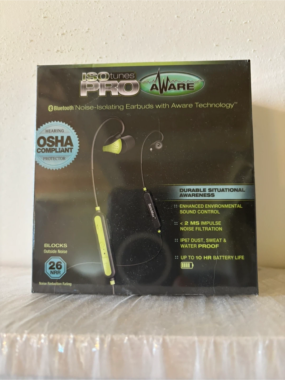 Selling a pair of ISOtunes Pro Aware Bluetooth noise-isolating earbuds. These earbuds feature Aware Technology for durable situational awareness and enhanced environmental sound control. They are OSHA compliant and block outside noise with a 26 NRR noise reduction rating. They are also IP67 dust, sweat, and waterproof, offering up to 10 hours of battery life