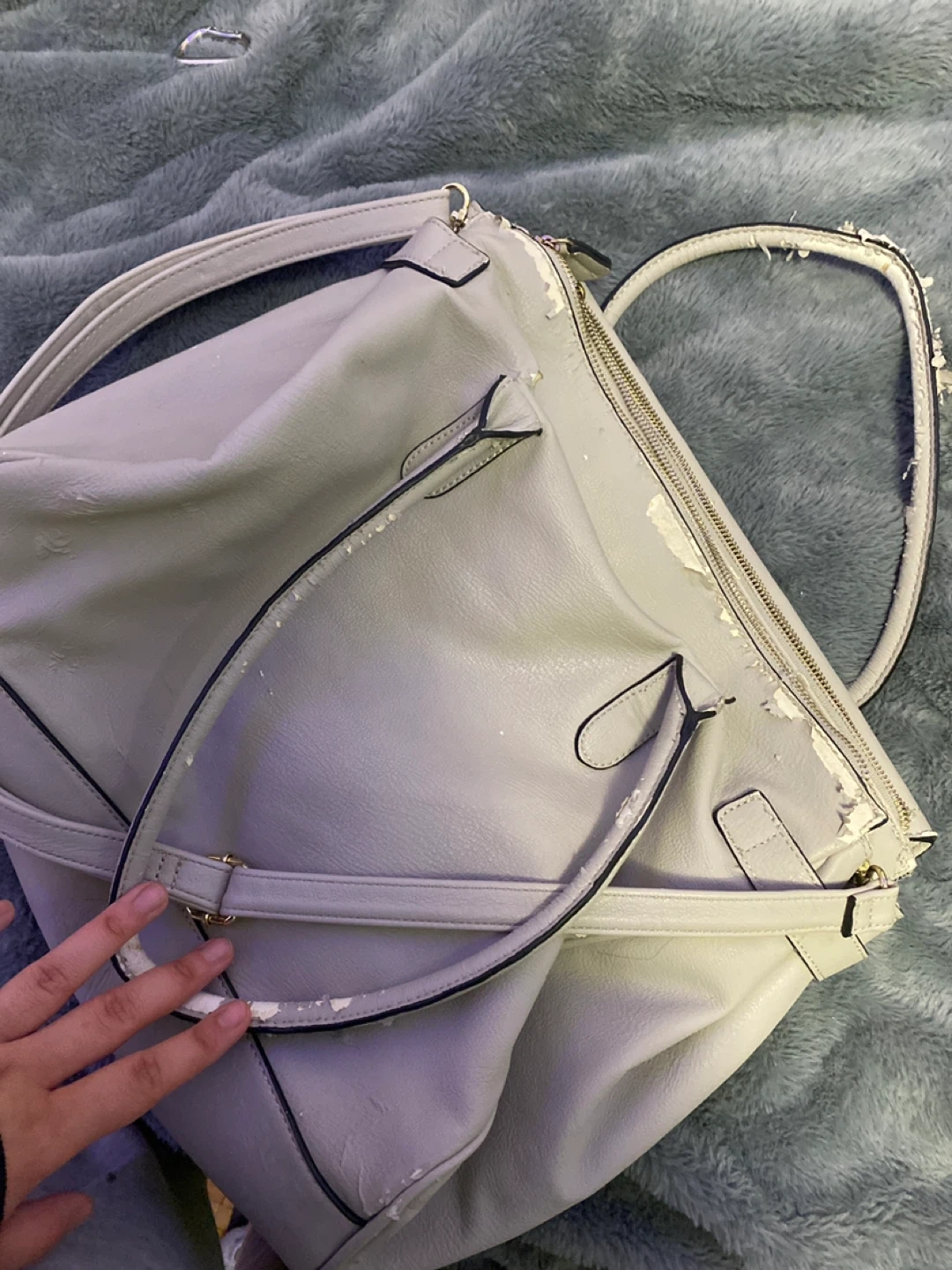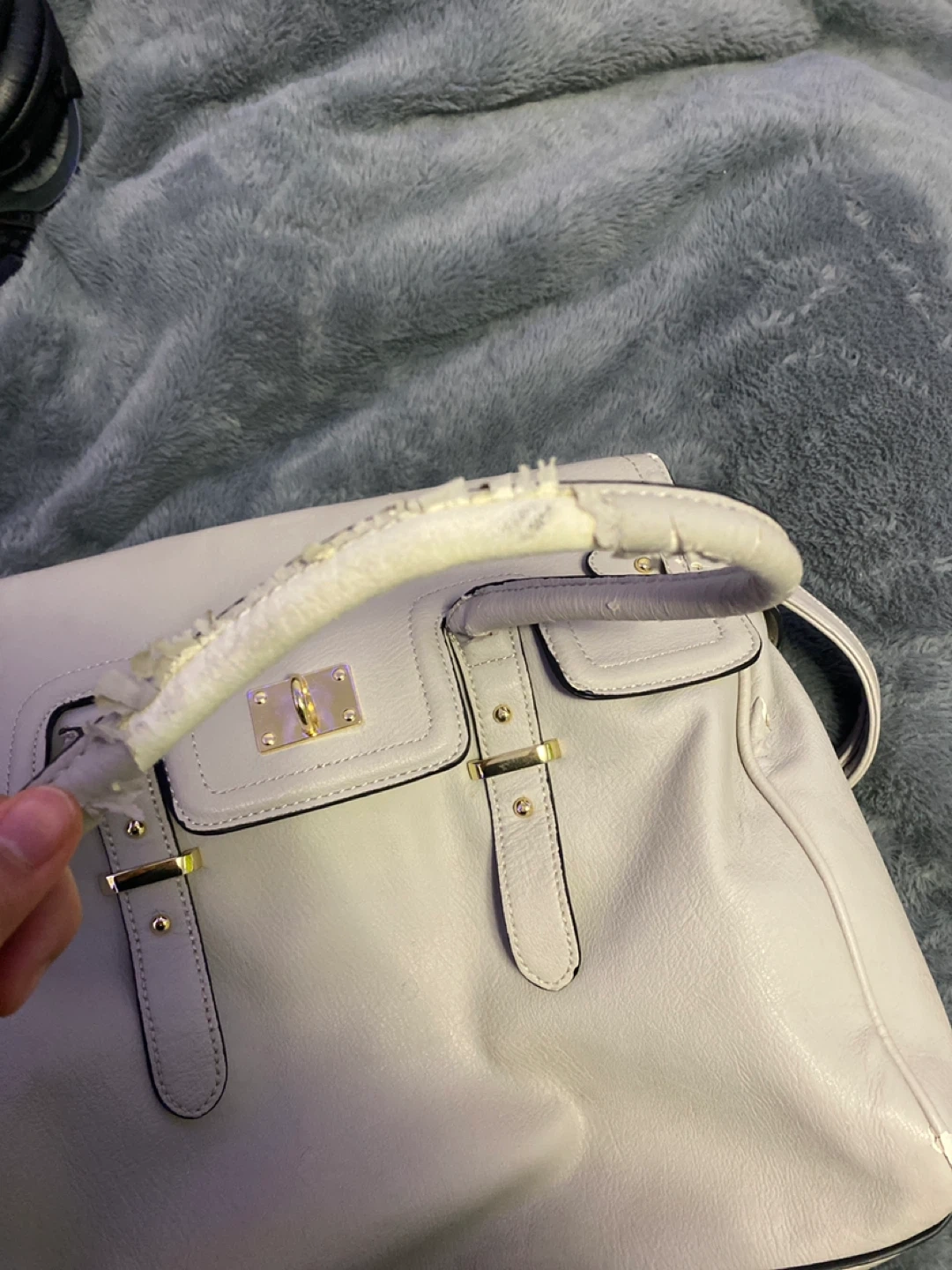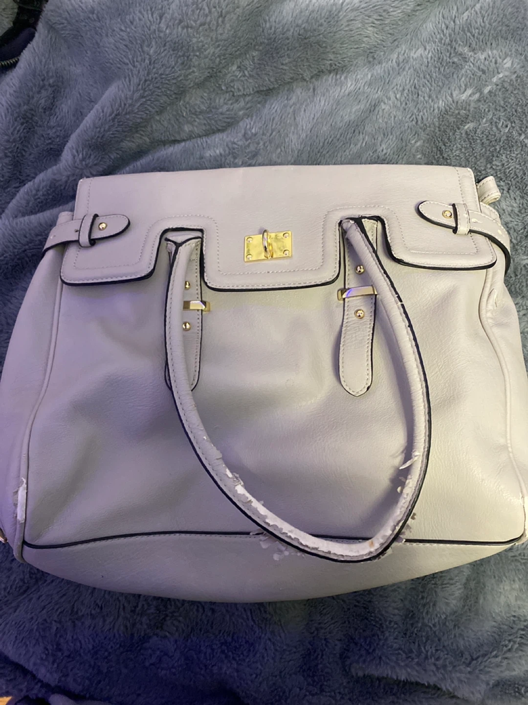 Light grey faux leather handbag with gold hardware. Showing significant wear on the handles and edges, with peeling faux leather. Zipper closure and adjustable strap included.