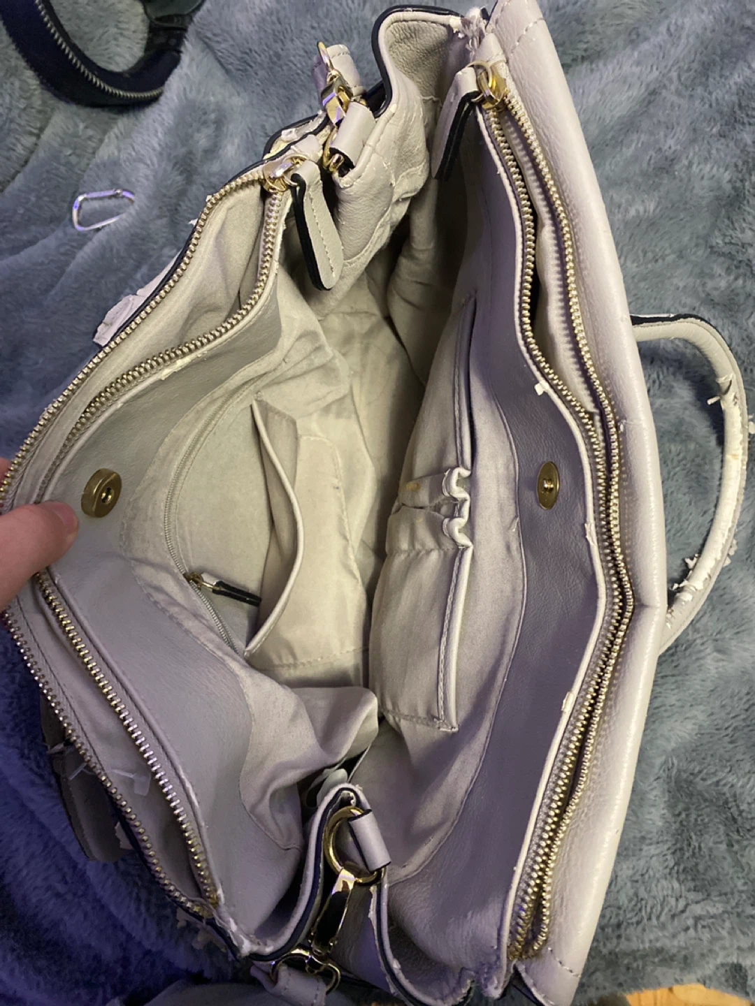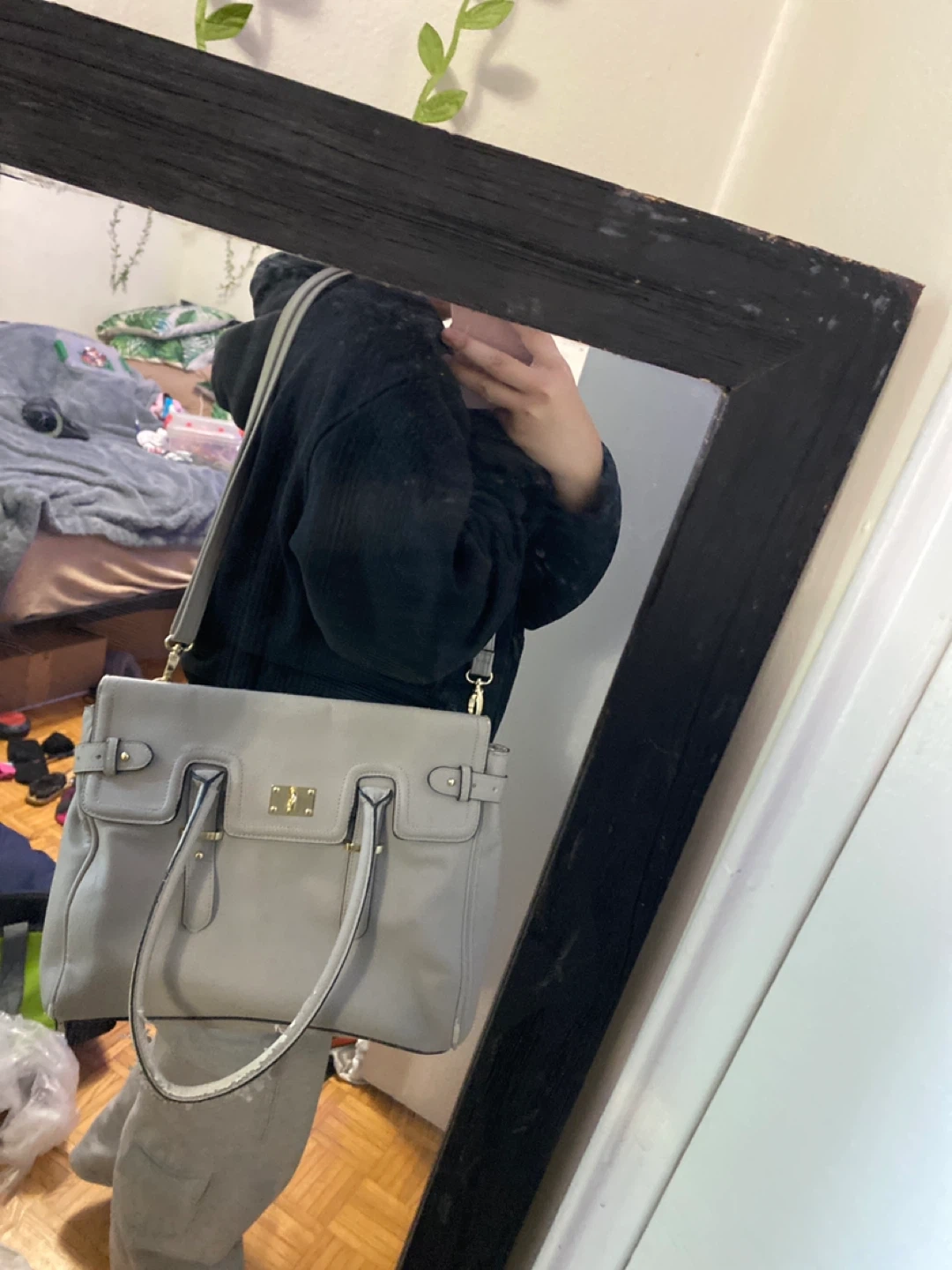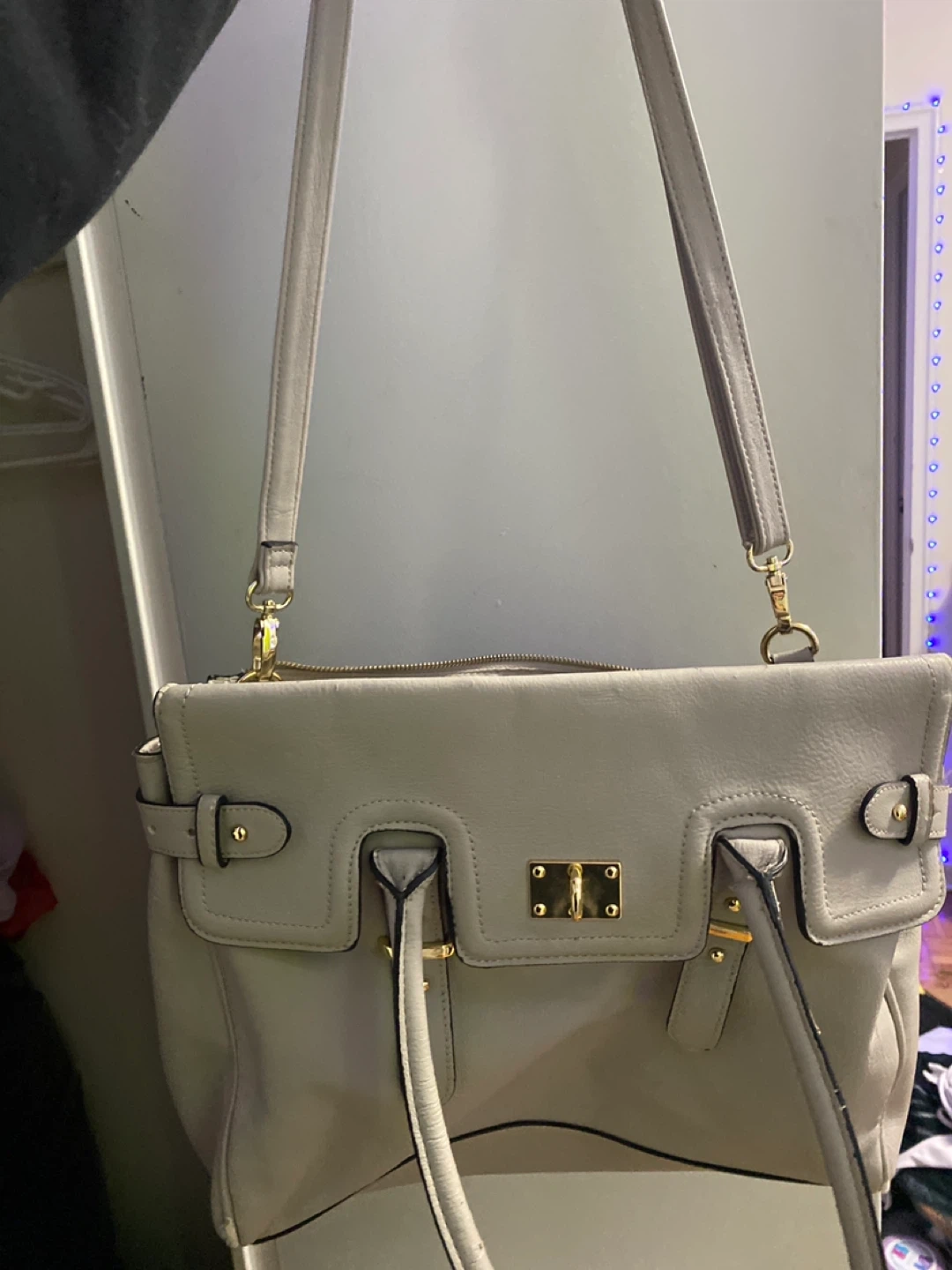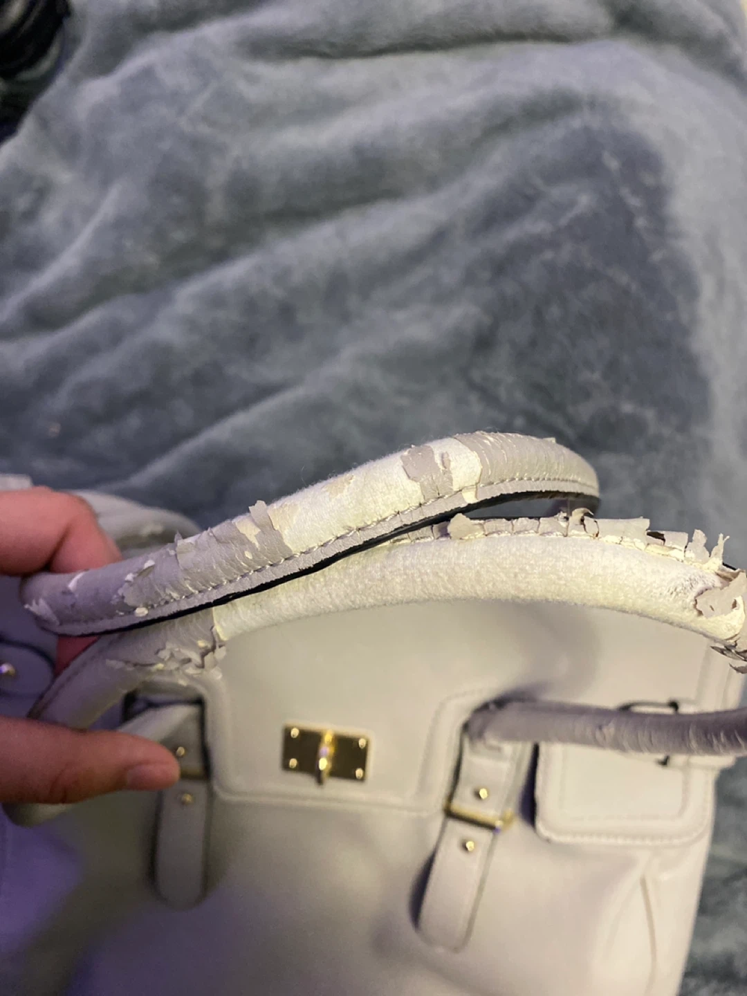 Light grey faux leather handbag with gold hardware. Showing significant wear on the handles and edges, with peeling faux leather. Zipper closure and adjustable strap included.