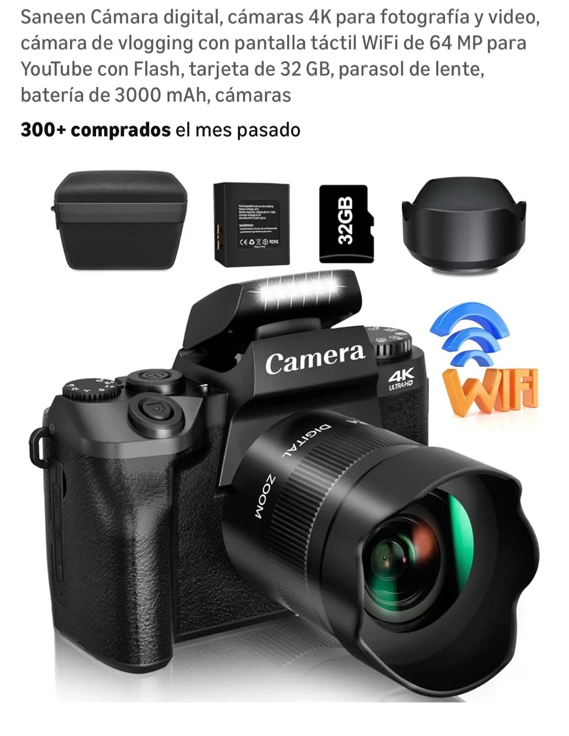 Selling a Saneen digital camera capable of 4K video and photography! It's also great for vlogging with its touch screen and WiFi capabilities. It has a 64 MP camera for YouTube, includes a flash, a 32 GB card, a lens hood, and a 3000 mAh battery