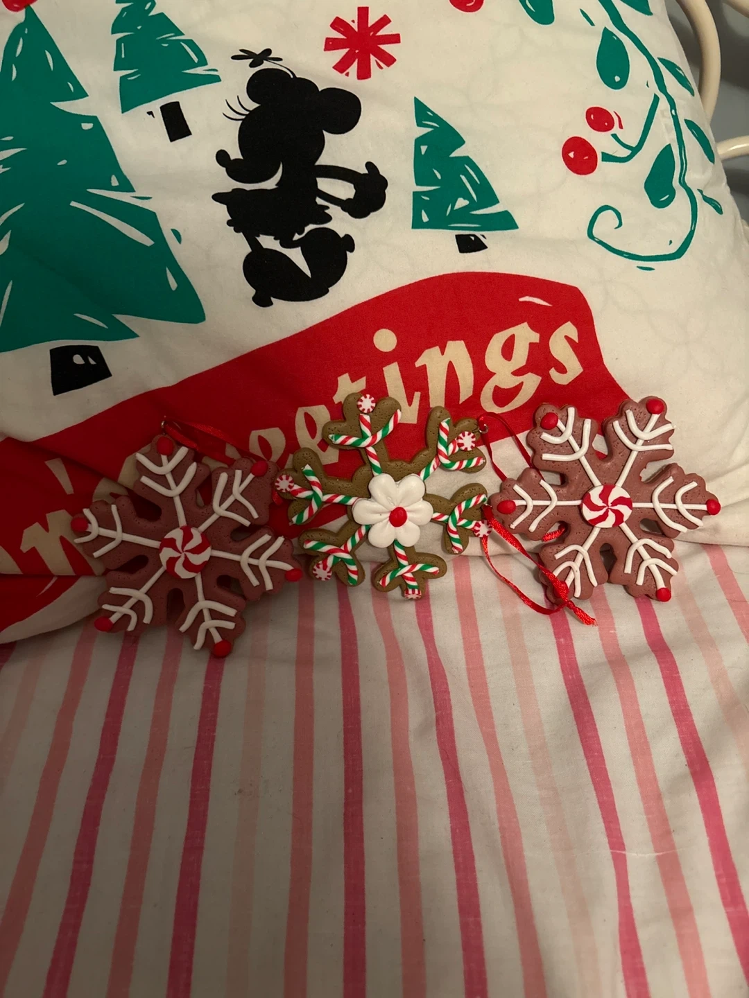 Three festive gingerbread-style ornaments shaped like snowflakes and holiday figures. They're adorned with white icing and candy cane details. Perfect for adding a sweet touch to your Christmas tree!