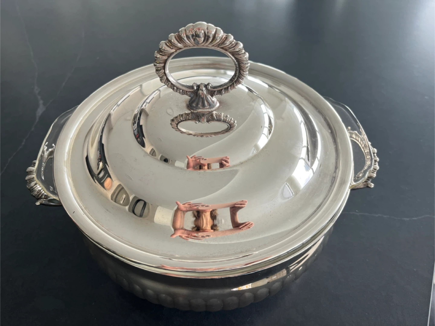 Elegant silver-plated serving dish with a clear glass insert and lid. Features ornate handles and knob. This dish is great for keeping food warm and serving meals at gatherings.