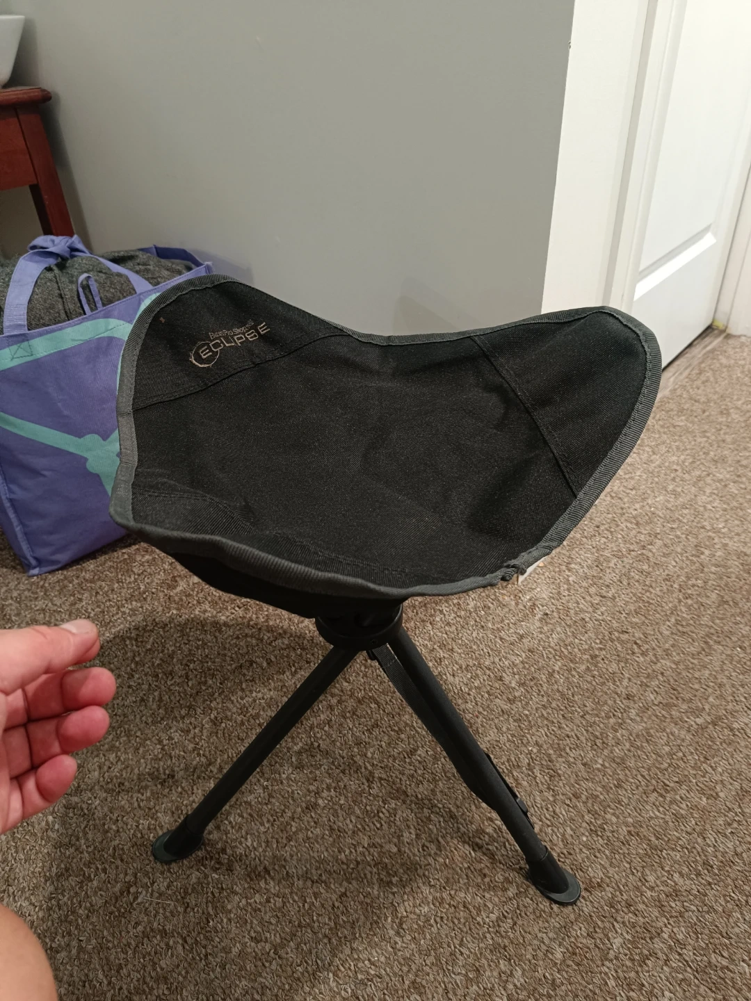 This is a compact, portable folding tripod stool from Bass Pro Shops' Eclipse line. It's made with a durable fabric seat and a sturdy metal frame. It's handy for camping, fishing, or any outdoor activity where you need a quick seat!
