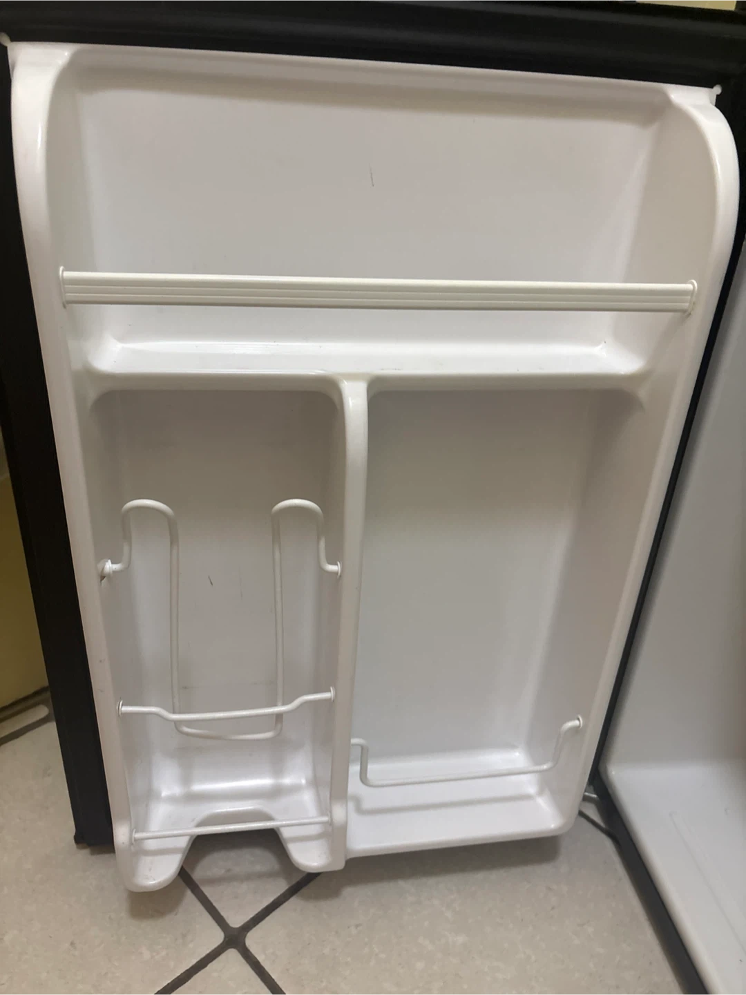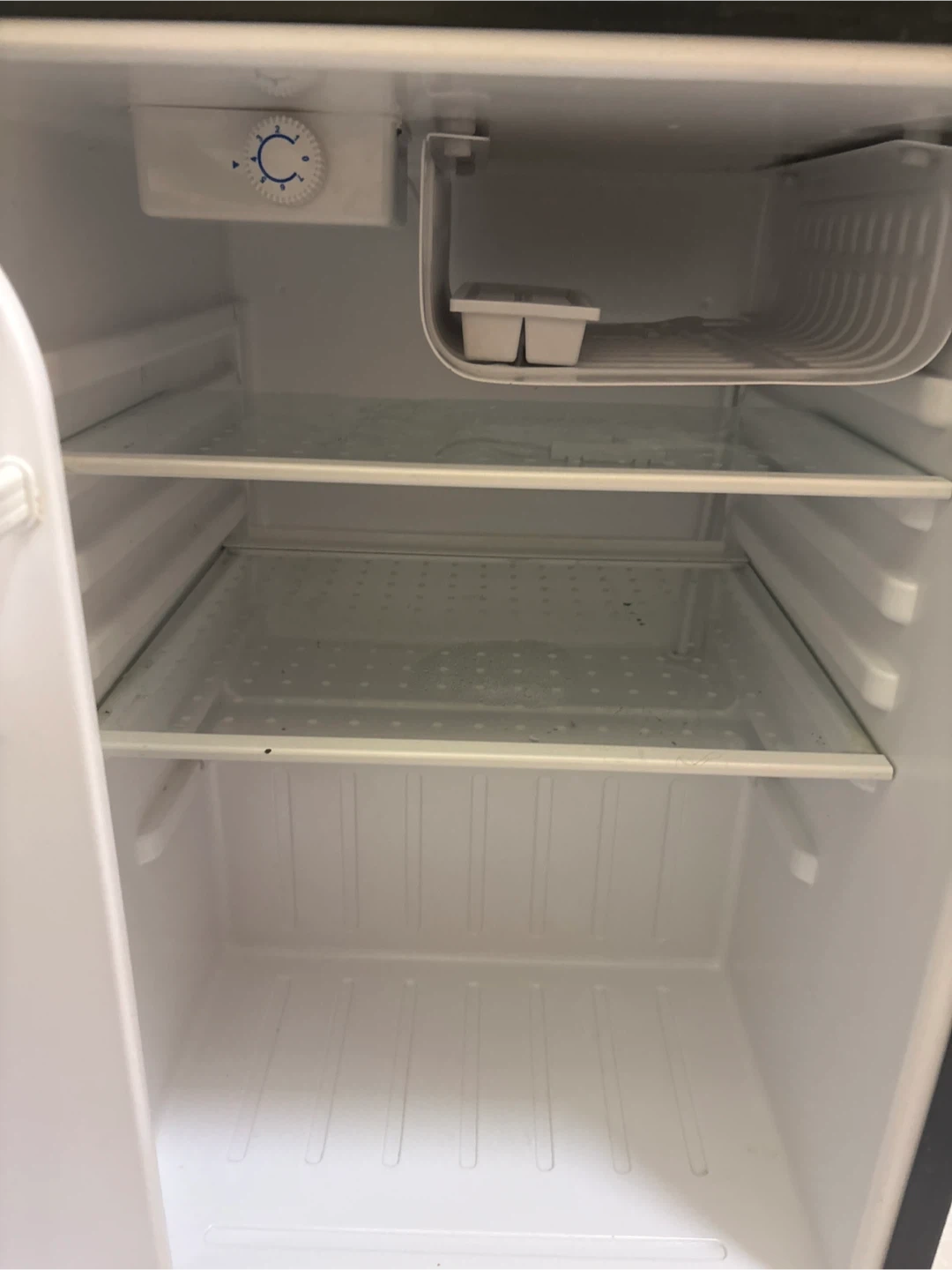 Compact black mini fridge with interior shelves and a door compartment. It's perfect for a dorm room or small office space. Has adjustable temperature control.