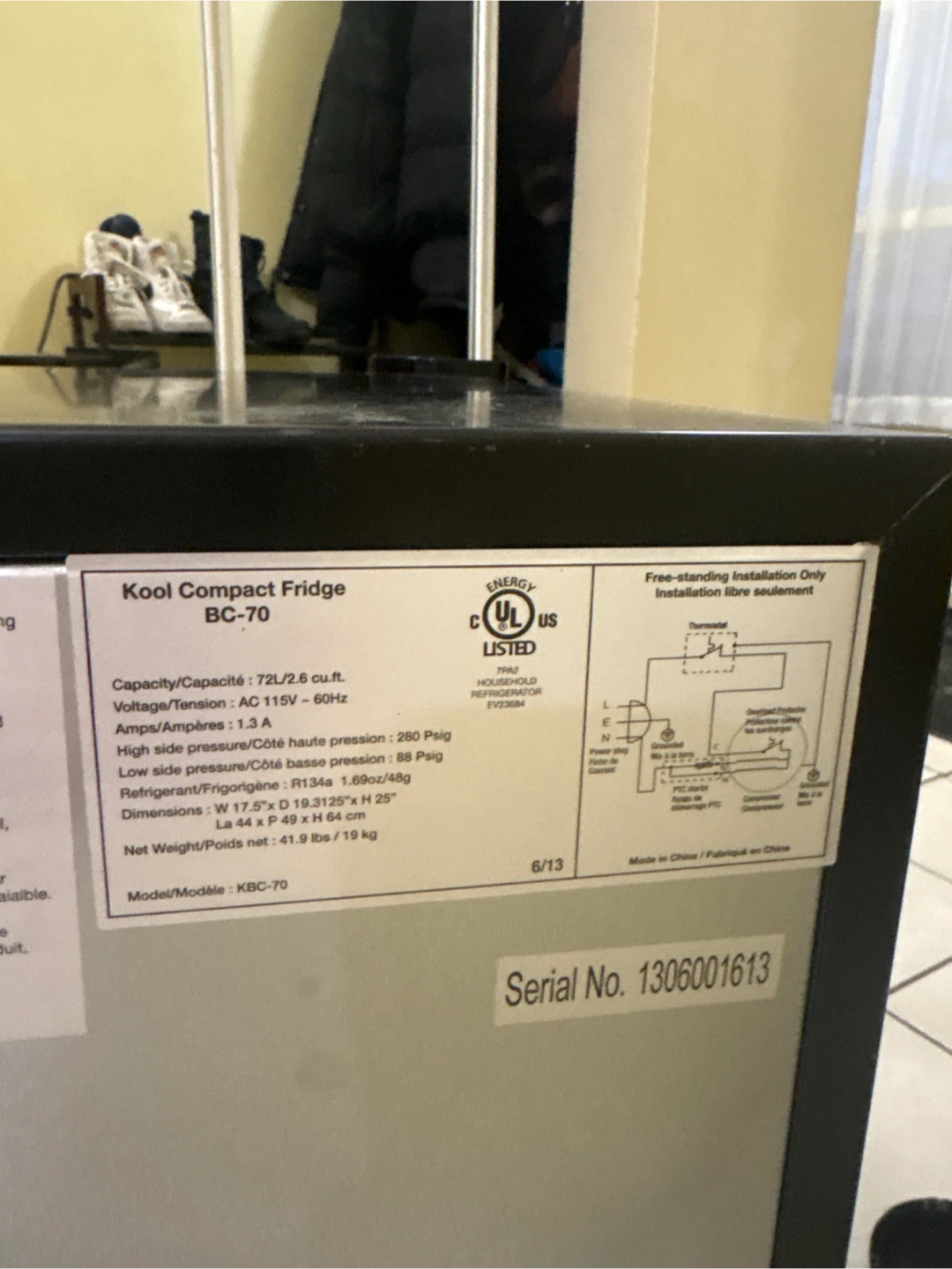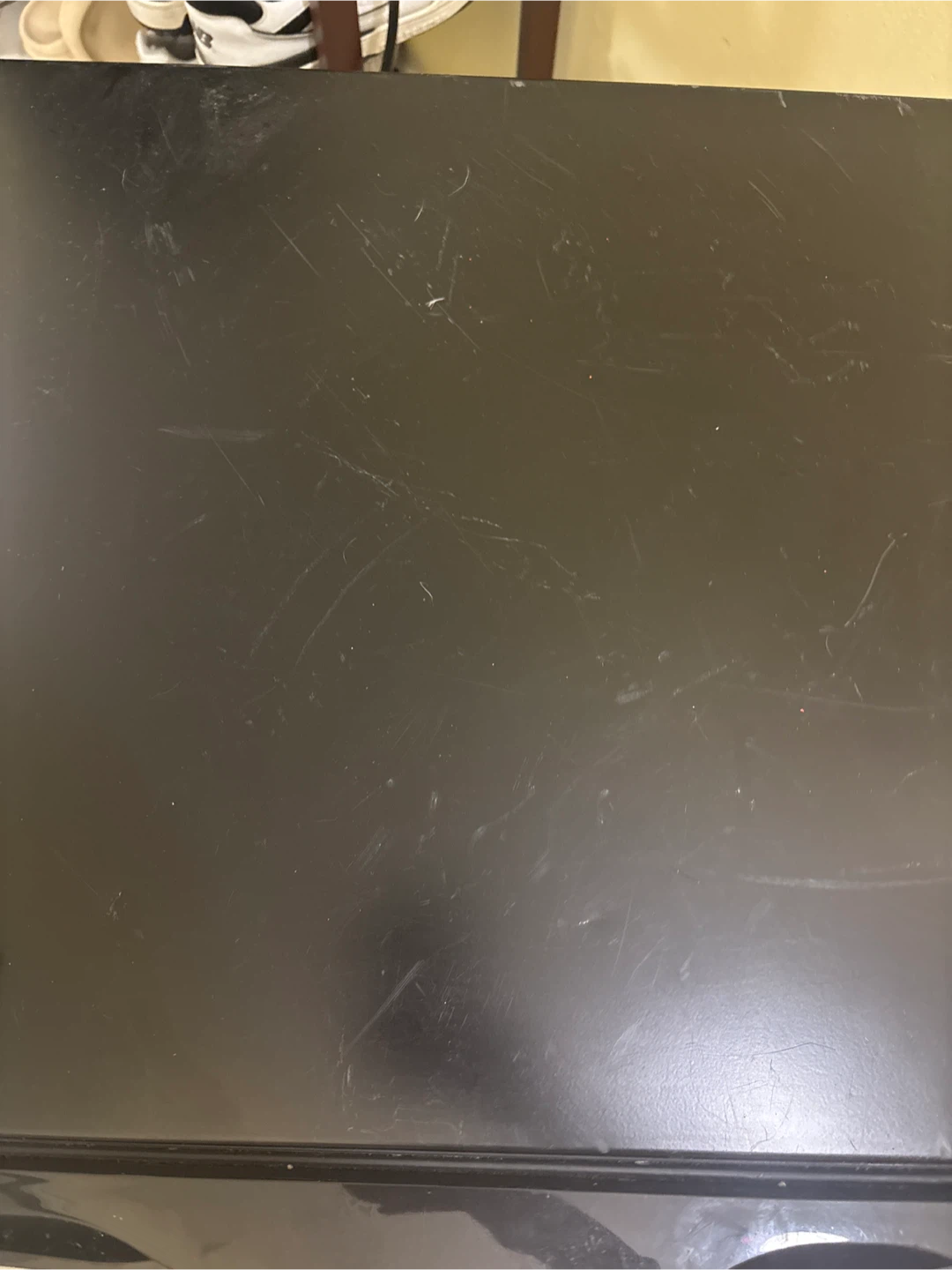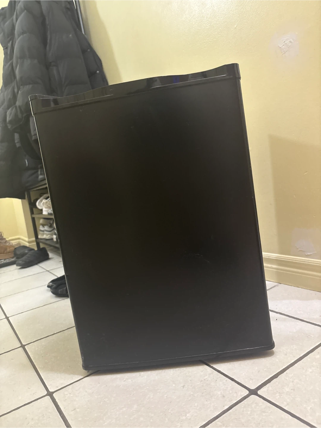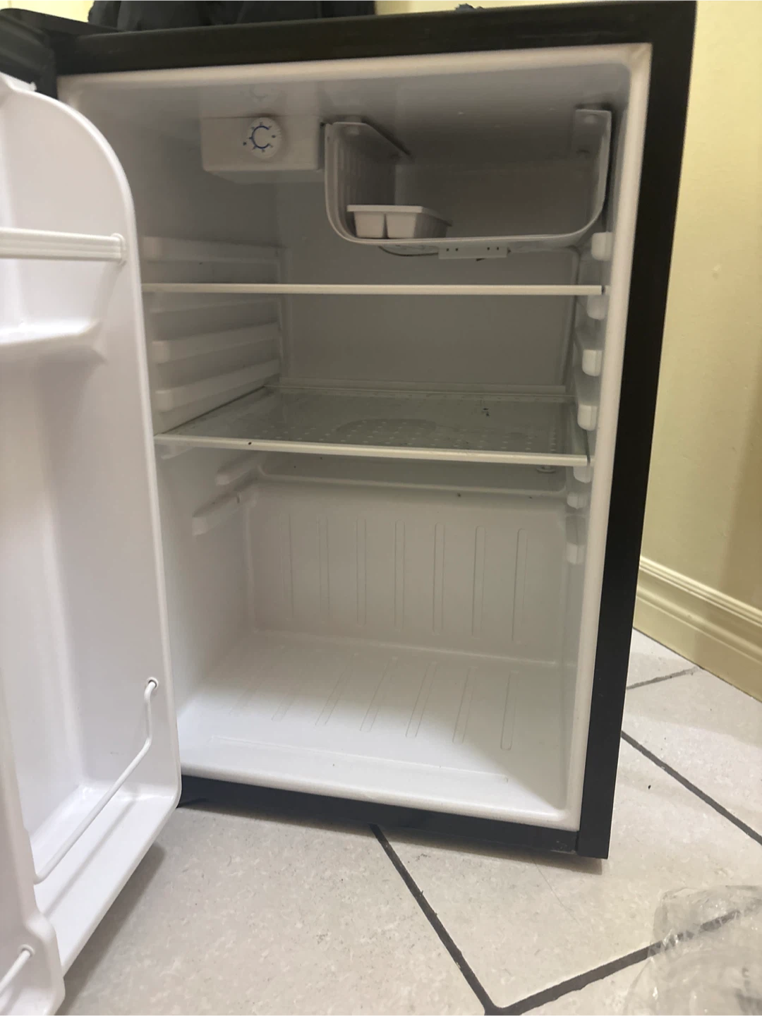 Compact black mini fridge with interior shelves and a door compartment. It's perfect for a dorm room or small office space. Has adjustable temperature control.