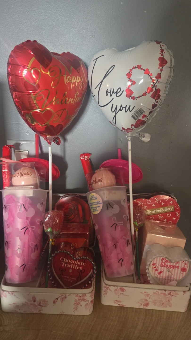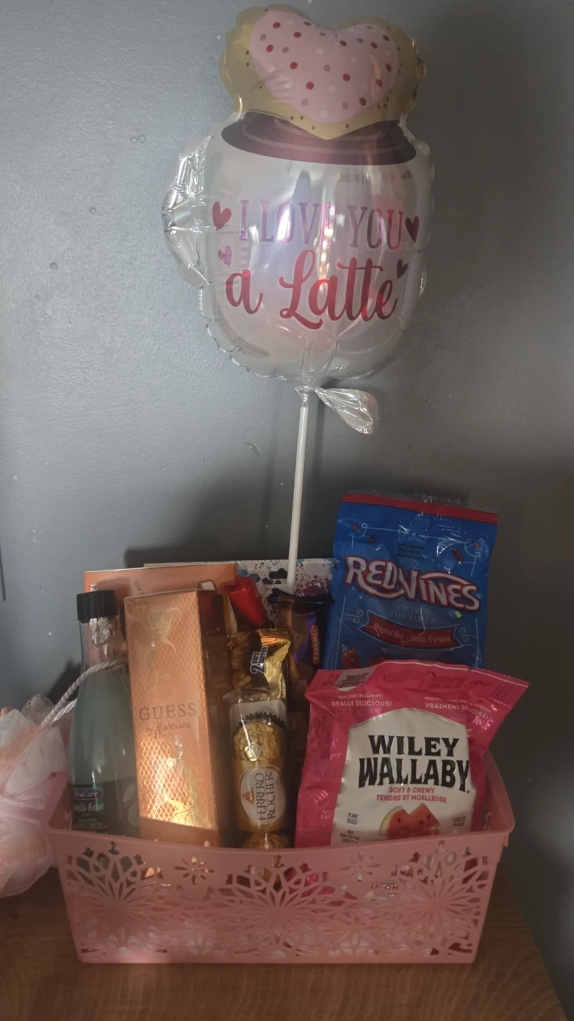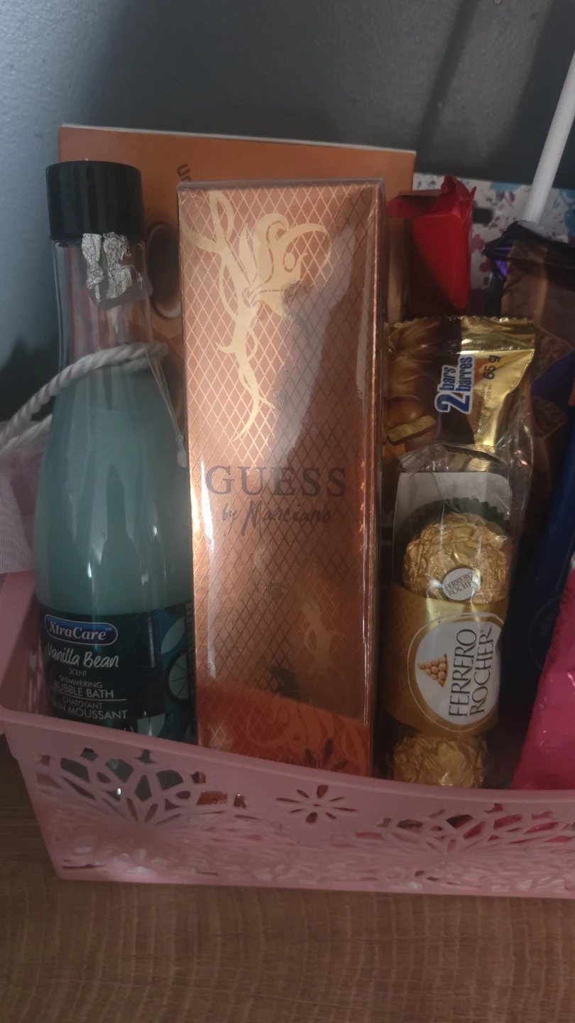 Guess Valentines Day Baskets. Comes with Guess Perfume, chocolate, colour changing bow/cherry cup, gummy rose, bathbomb. Packaged and ready to go!! $70 4 available