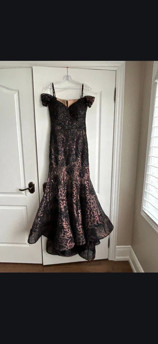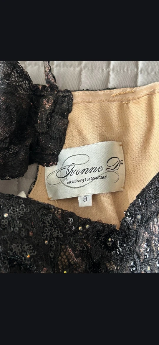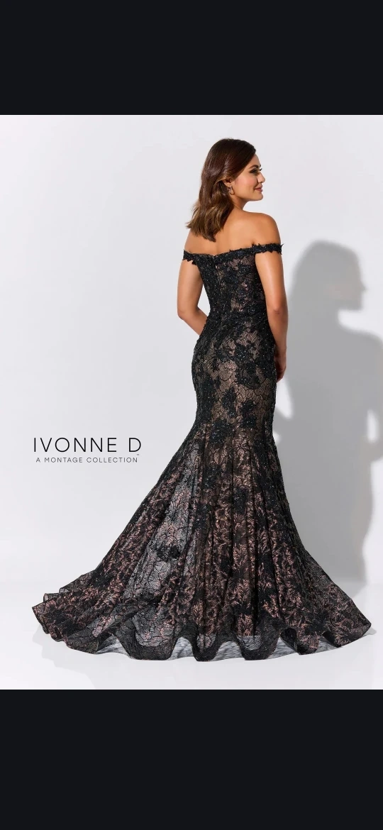 Gorgeous Ivonne D gown in black with intricate lace and sequin detailing. It features an off-the-shoulder neckline and a flattering mermaid silhouette. This dress is a size 8 and perfect for formal events or special occasions!