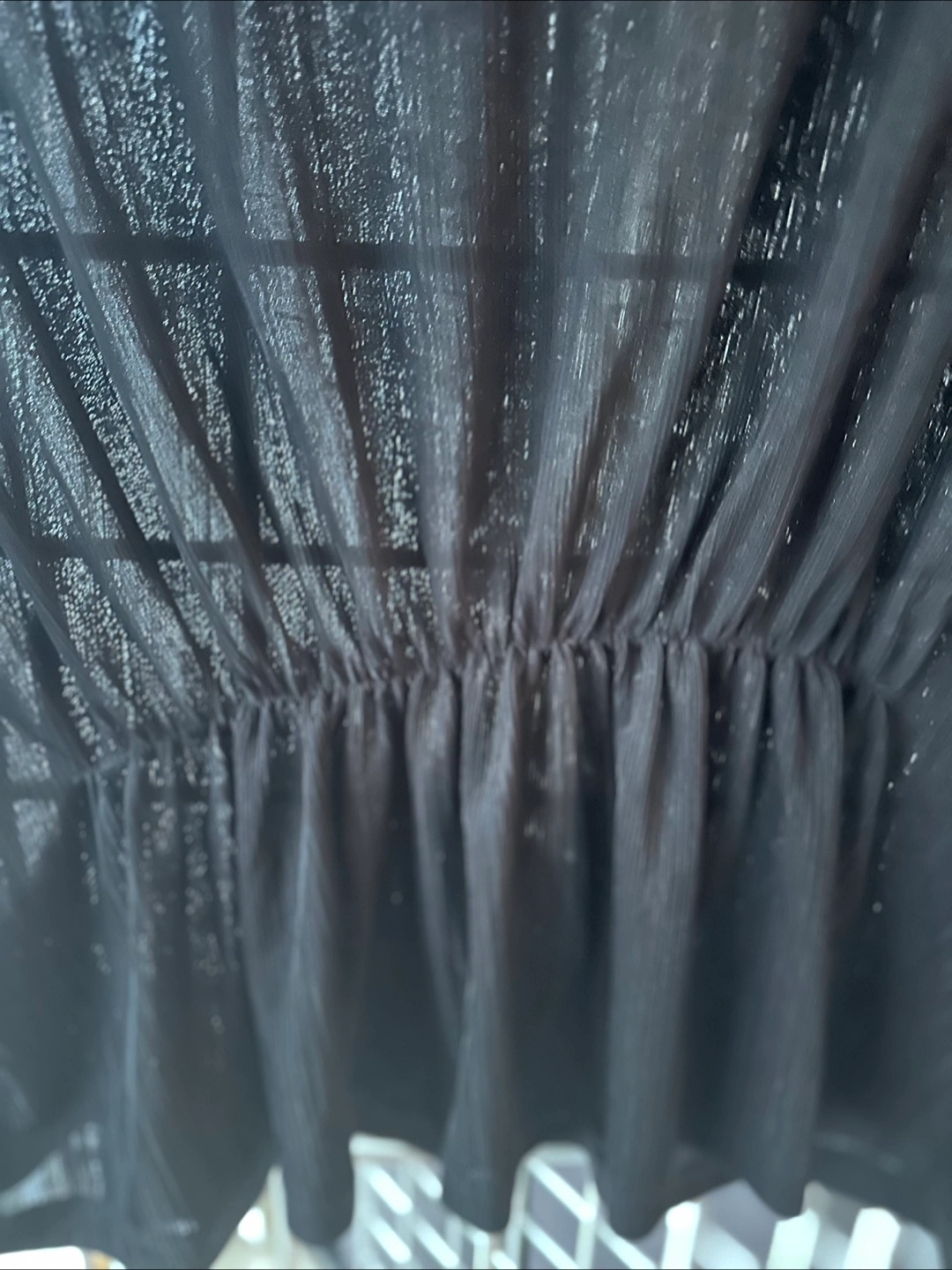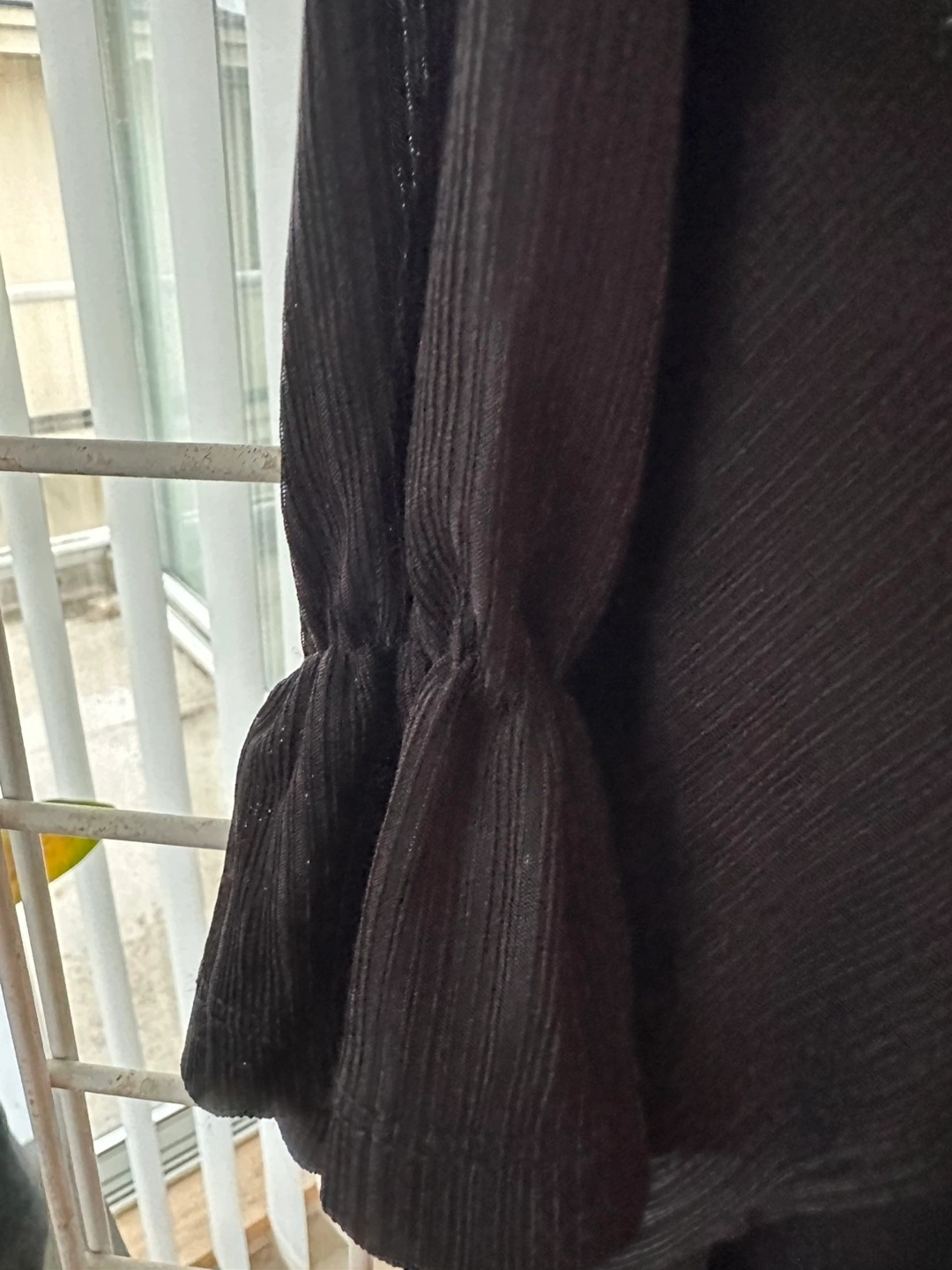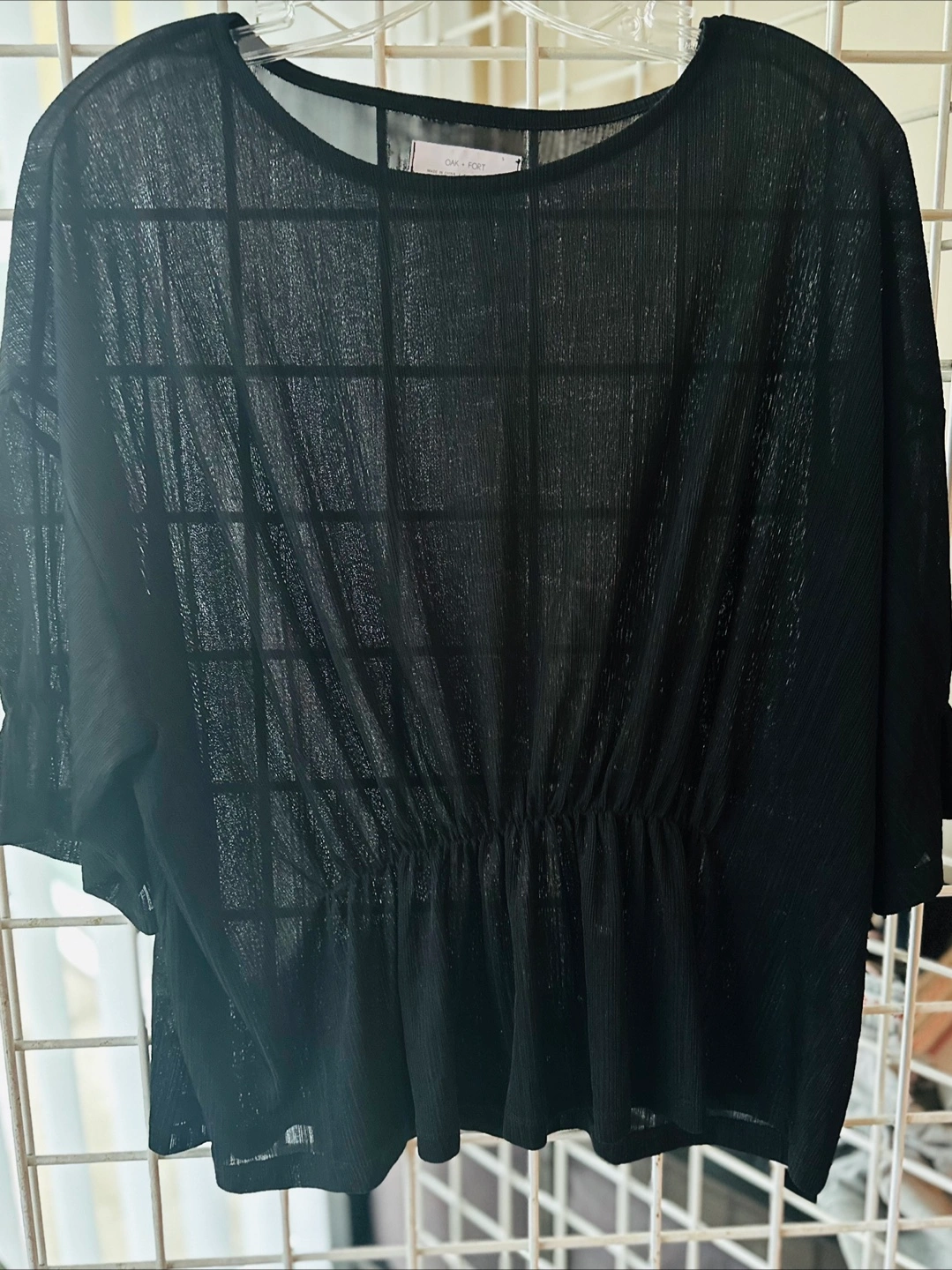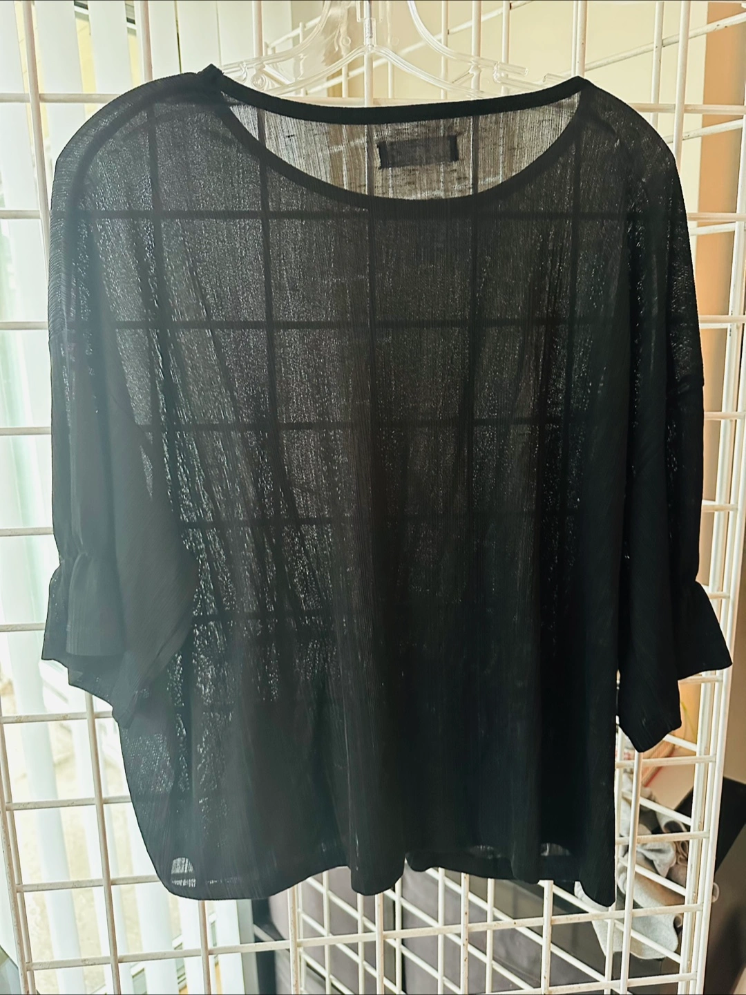 Black sheer cropped blouse. Features short sleeves with ruffled cuffs and a fitted waist. Semi-transparent material. Size small.