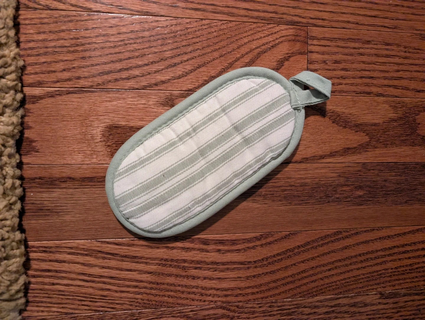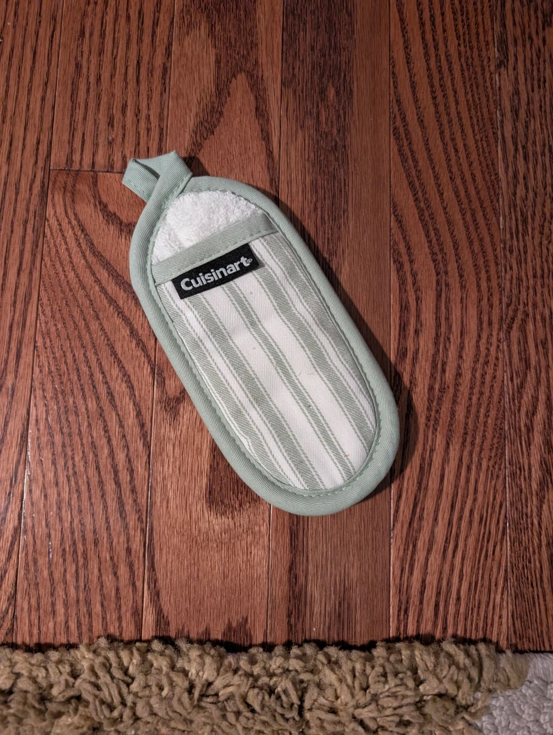 New unused Cuisinart handle for pot or pan. Green and white pattern. Slip on style. Loop hook for hanging. 100% cotton. Made in China.