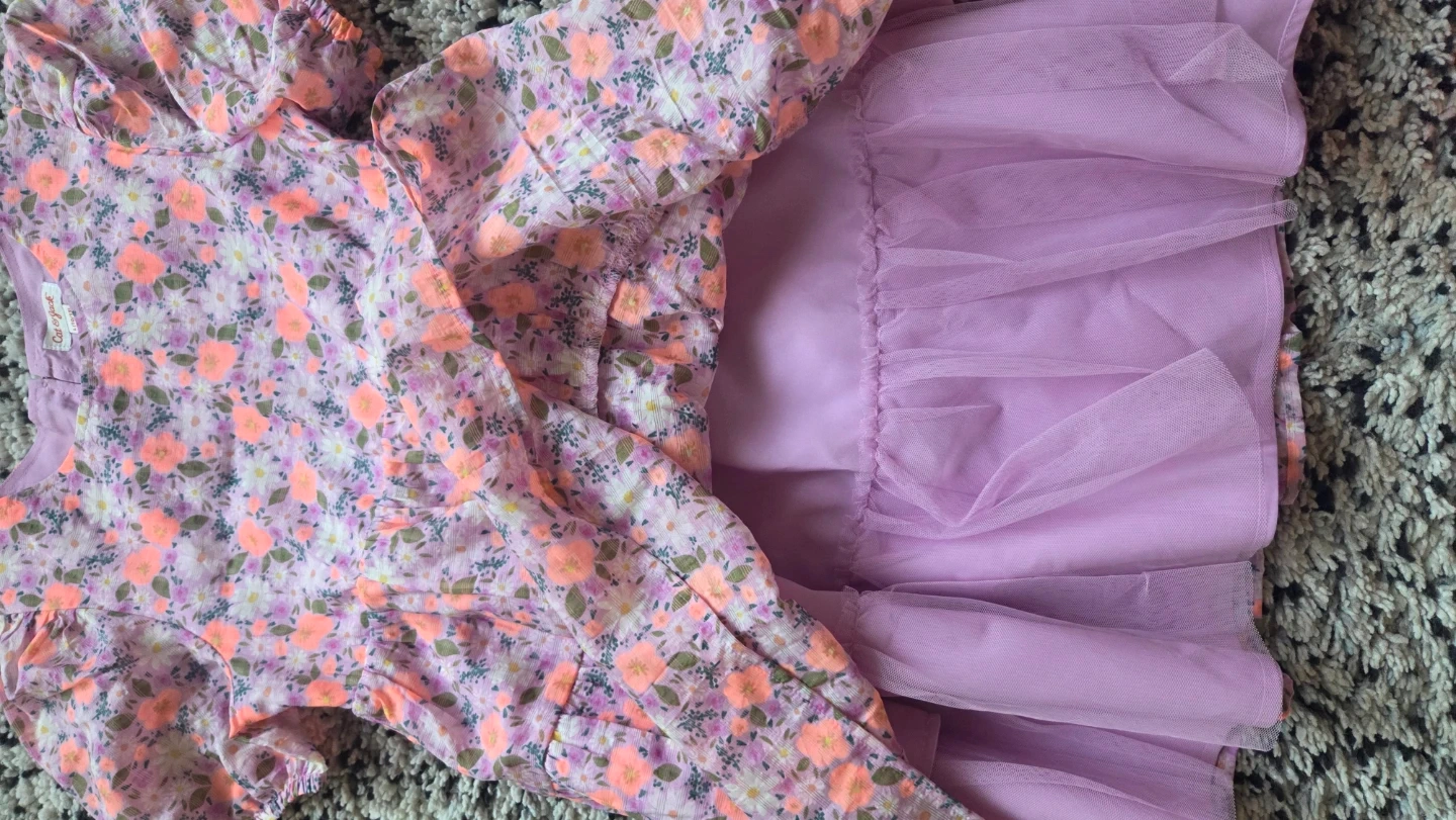 This adorable Cat & Jack dress features a vibrant floral print with puff sleeves. It has a tiered skirt and a keyhole back closure. Made with a lightweight fabric for comfortable wear.