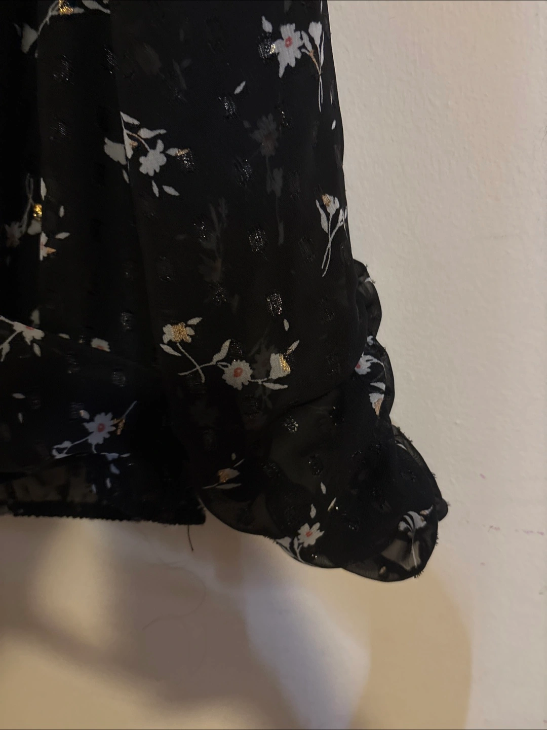 Selling a cute floral print blouse from Dynamite! It's a sheer black material with a wrap-style front. Perfect for dressing up or down!