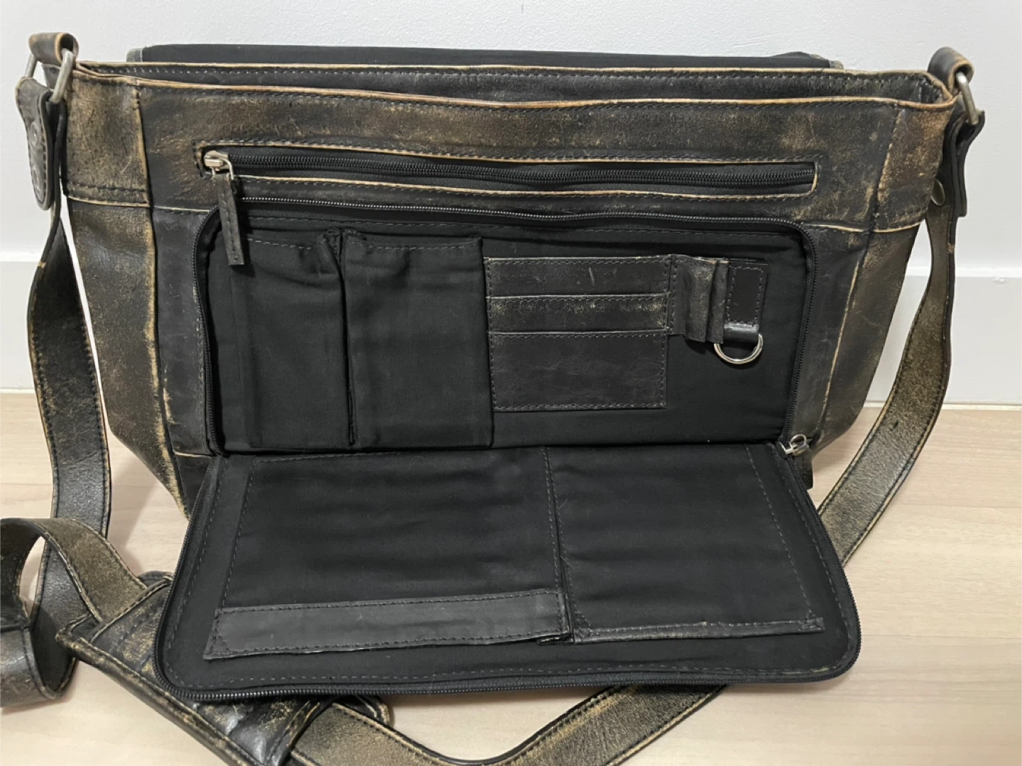 Sanded calf flap-over brief w/outside zip pocket on flap.