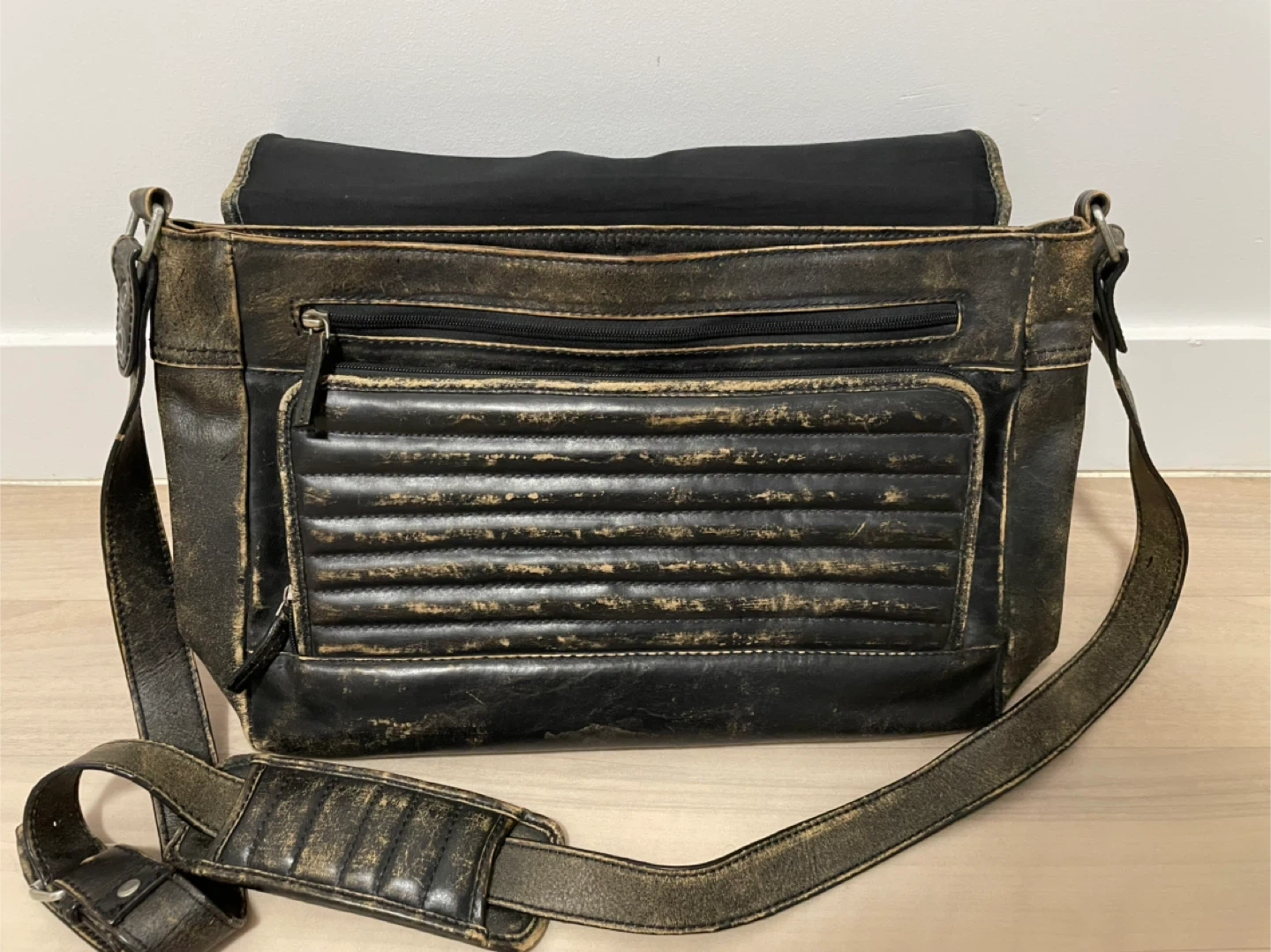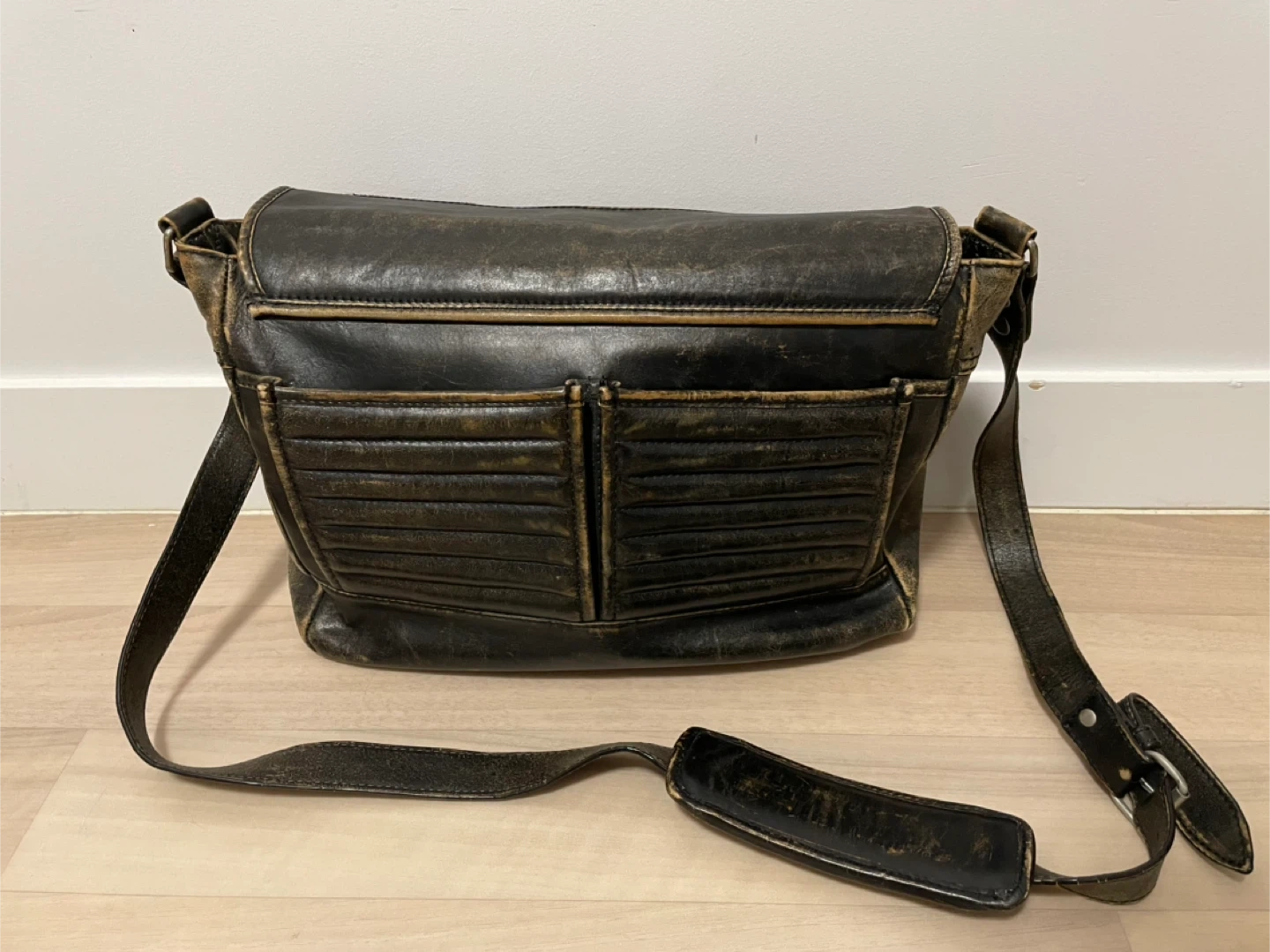 Long leather shoulder strap (1.25" wide) with belt buckle to adjust length.