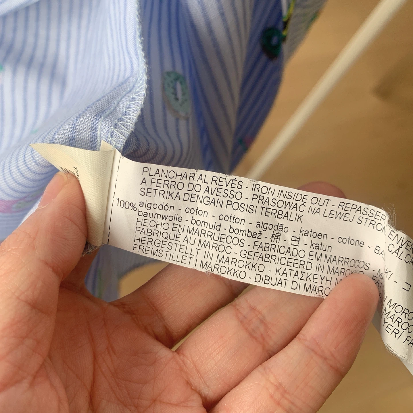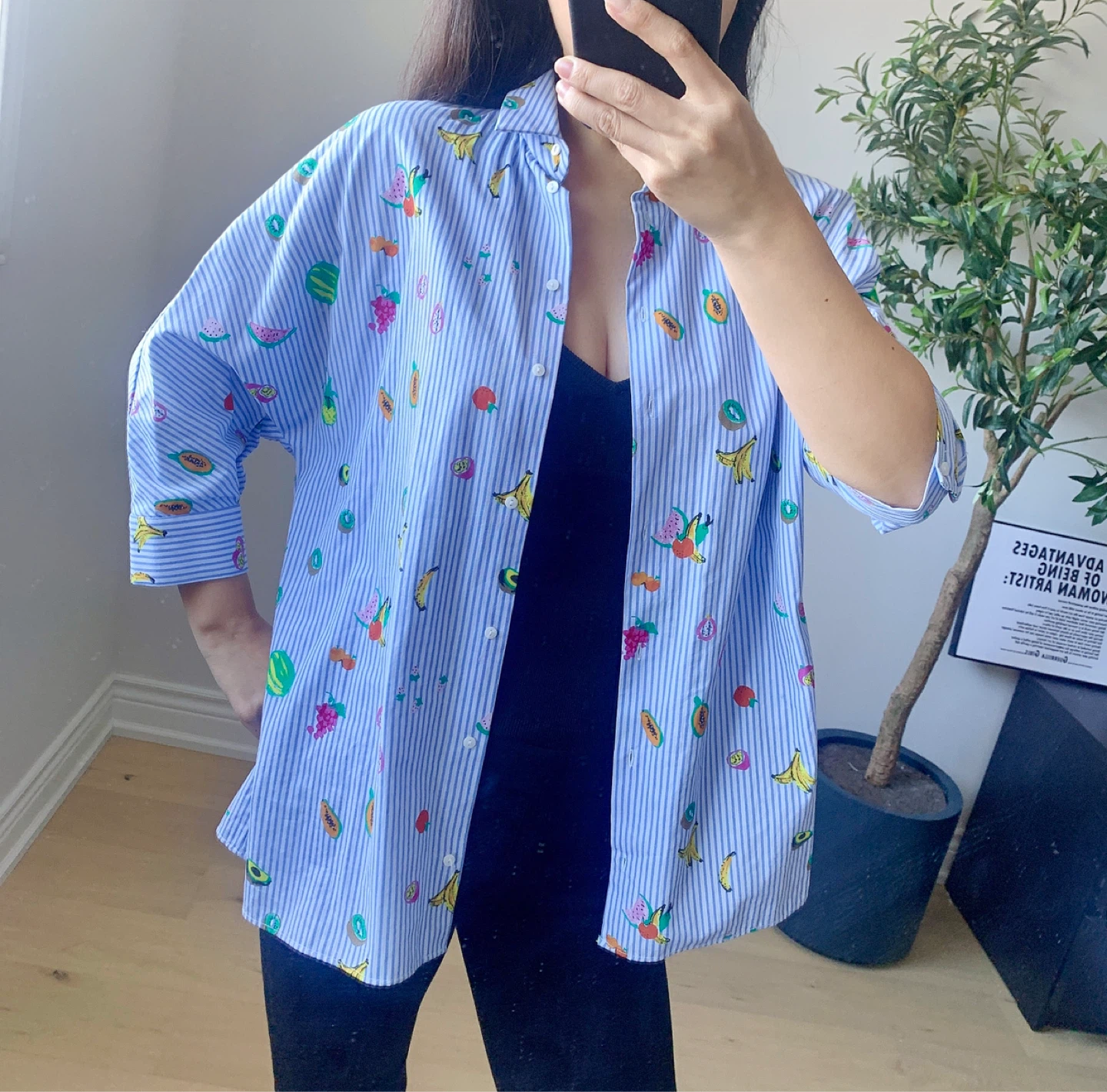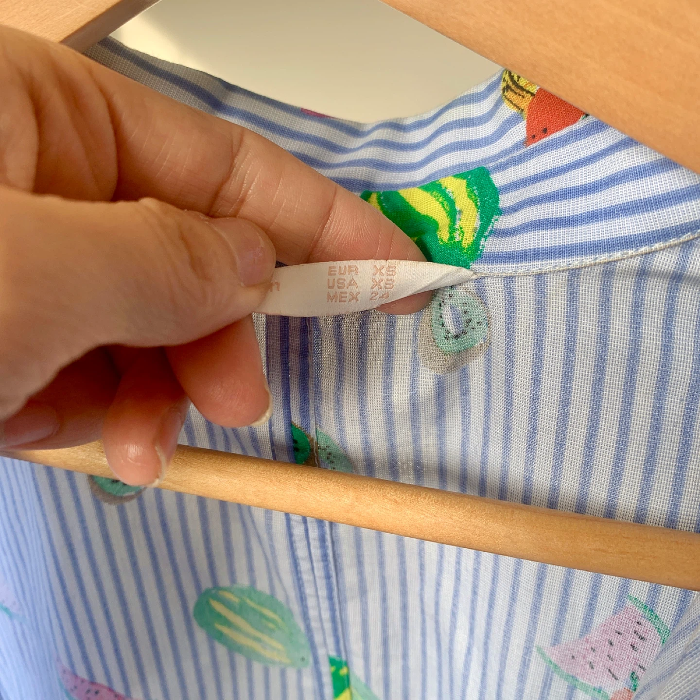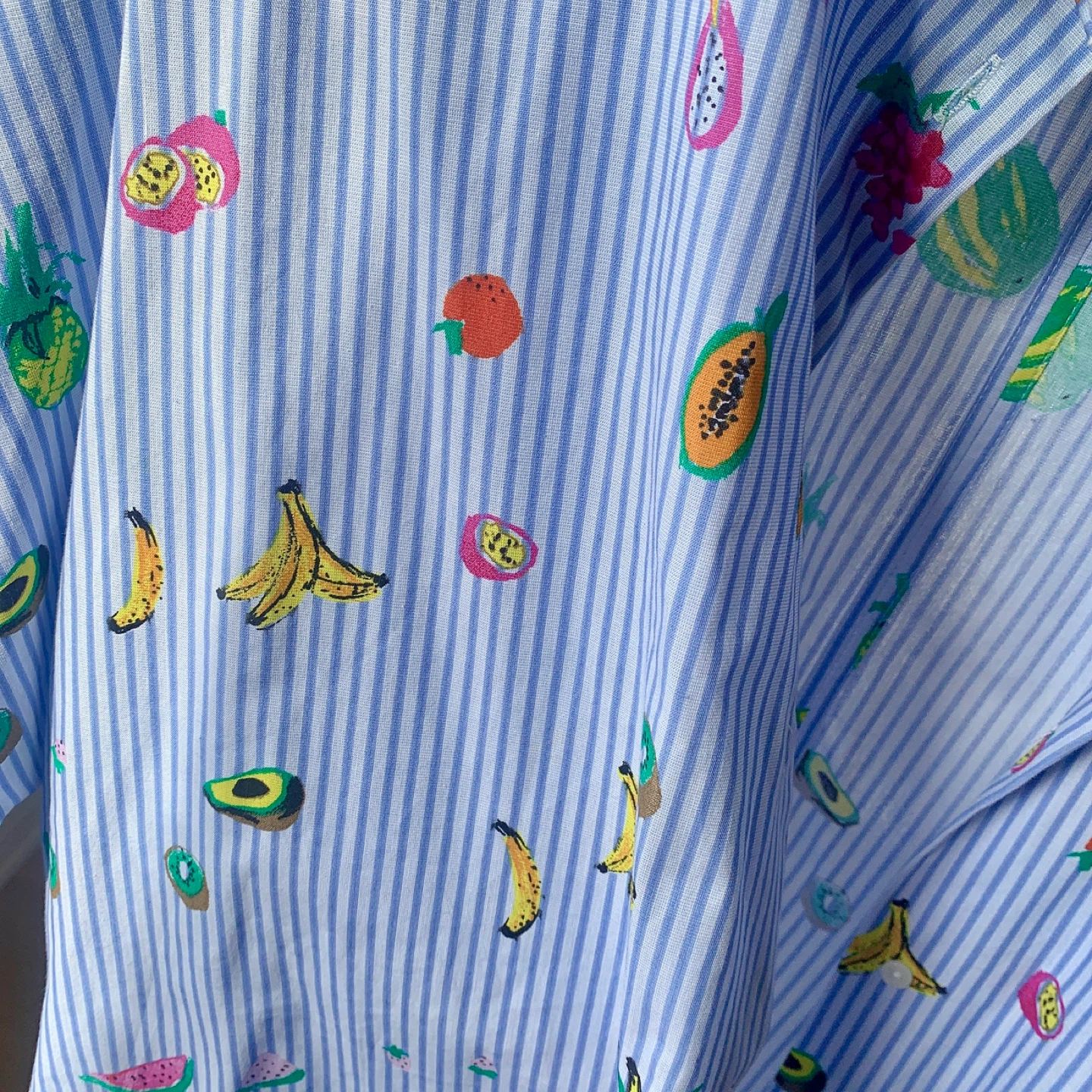 ZARA oversized shirt featuring classic blue and white vertical stripes with playful, colorful fruit prints throughout. The relaxed, oversized silhouette gives it a casual yet eye-catching look. Designed with dropped shoulders and a loose fit, finished with a subtle back slit for added comfort and movement. Easy to style worn open or buttoned up. • Brand: ZARA • Size: Extra Small (designed oversized) • Shoulder: 47 cm • Bust: 104 cm • Length: 70 cm • Back slit detail • Care label: Present • Condition: Very good, worn once or twice, no visible flaws Model reference: 168 cm / 120 lbs
