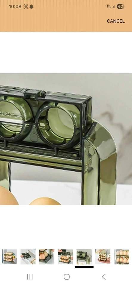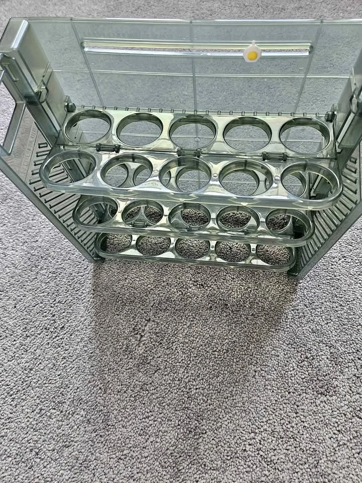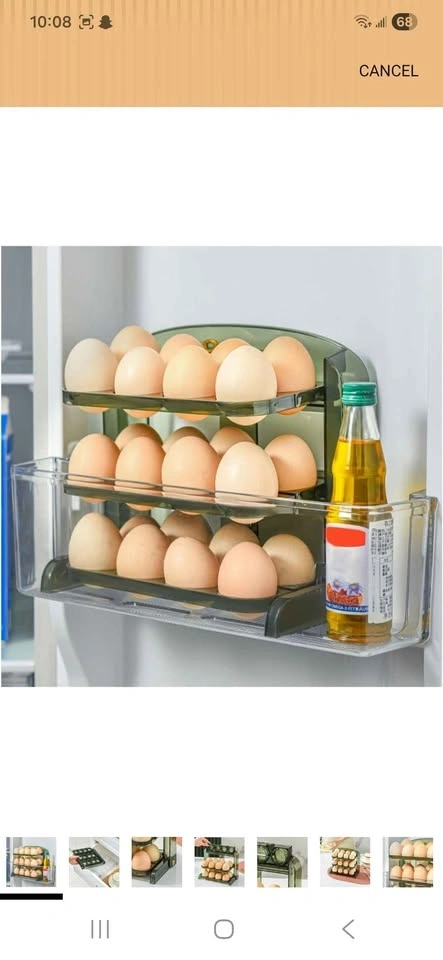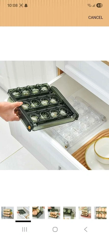 Brand new foldable egg holder, 3 layers plastic egg tray container with deepened chute for home kitchen refrigerator shelf countertop (Transparent Green). Holds around 30 eggs, 10 eggs in each layer.