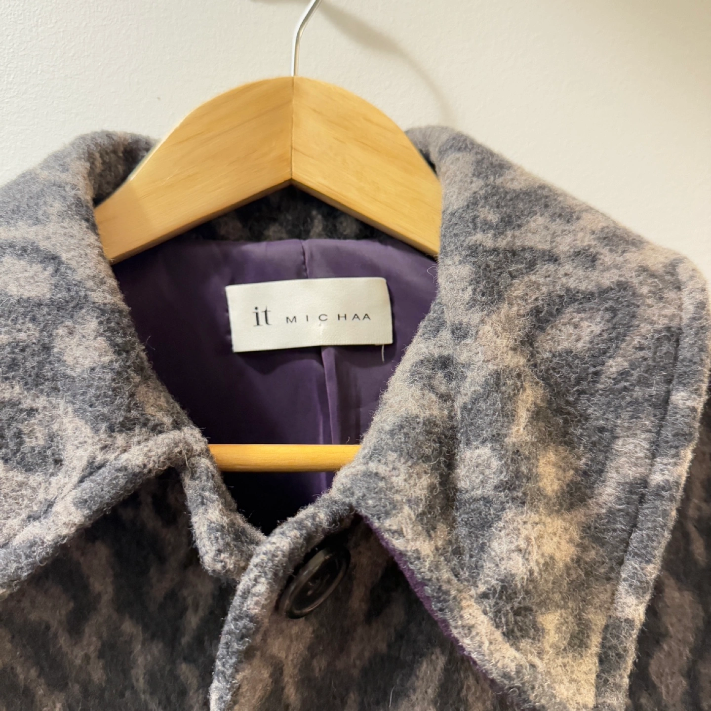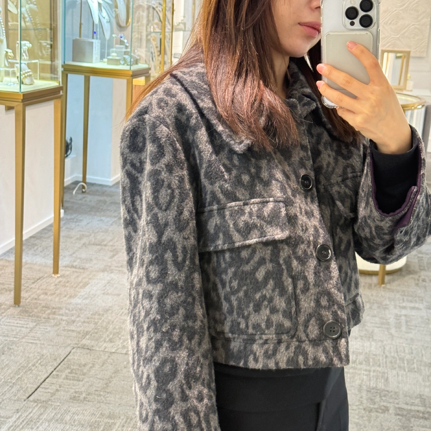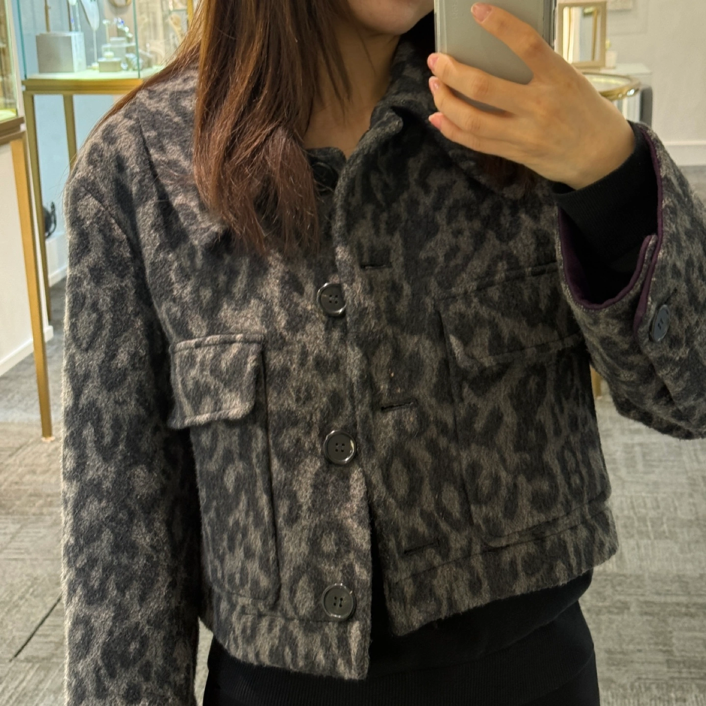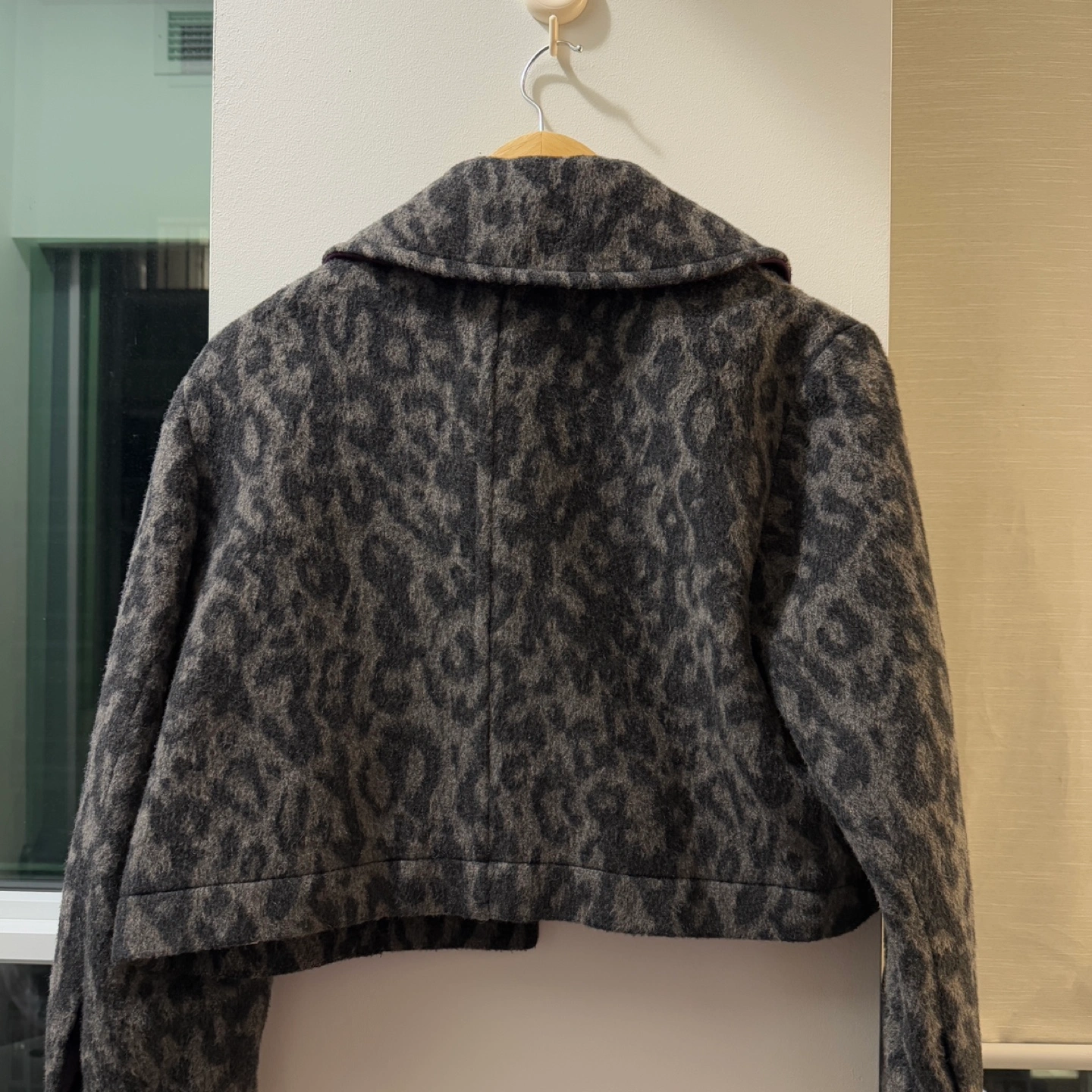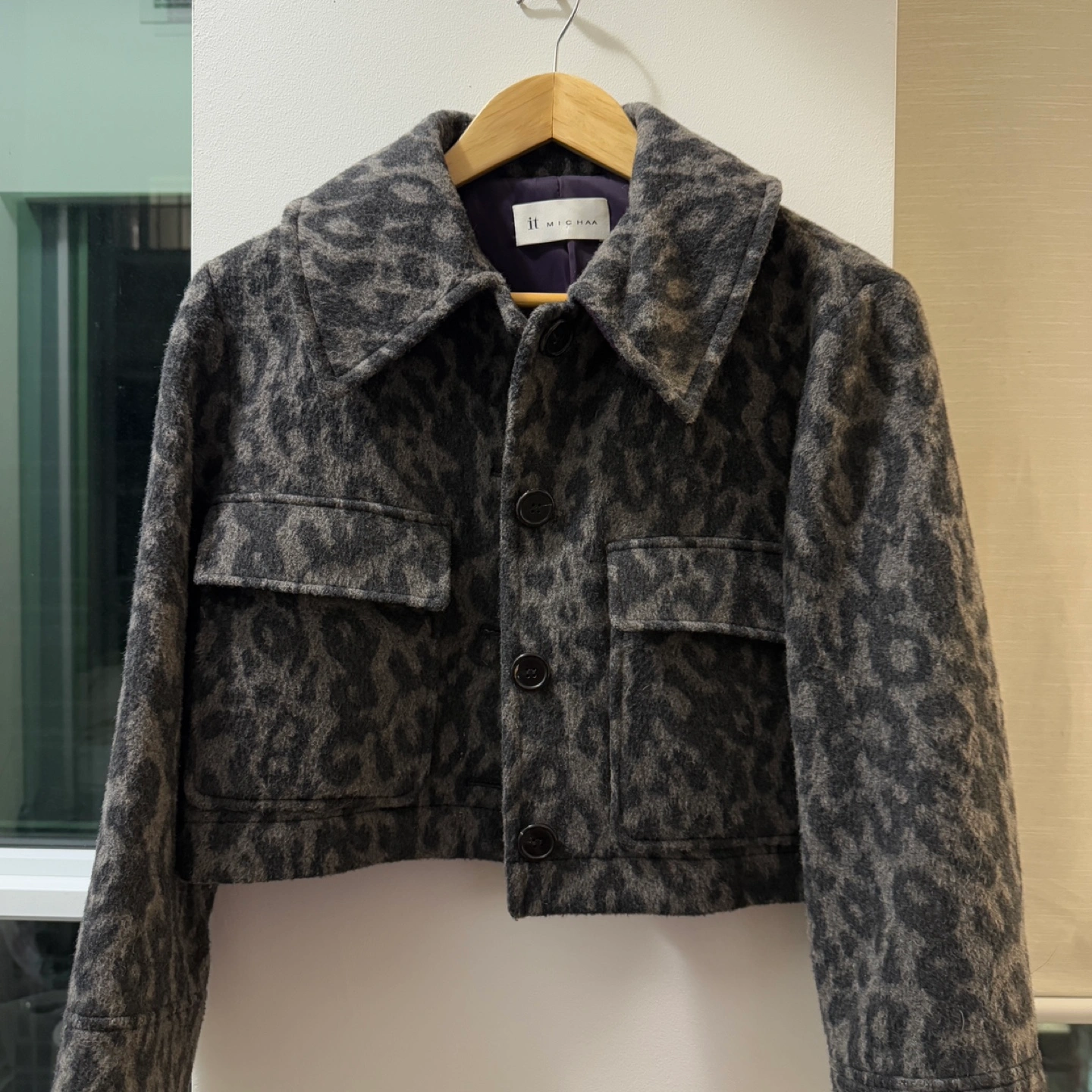 Korea brand, bought in Korea department store Women's cropped button-up jacket. Features a leopard print pattern. Made of a wool blend. Long sleeves, collared neckline. Two flap pockets.