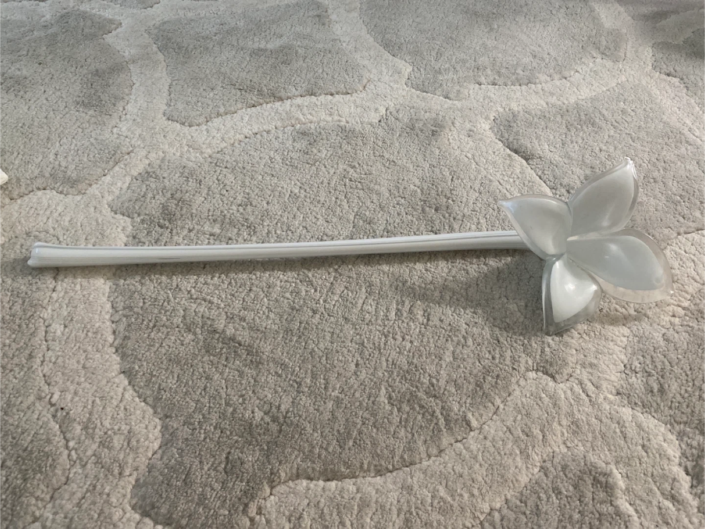 This is a white wand topped with a decorative white flower. It's made of a smooth, reflective material. The wand has a long, slender handle.