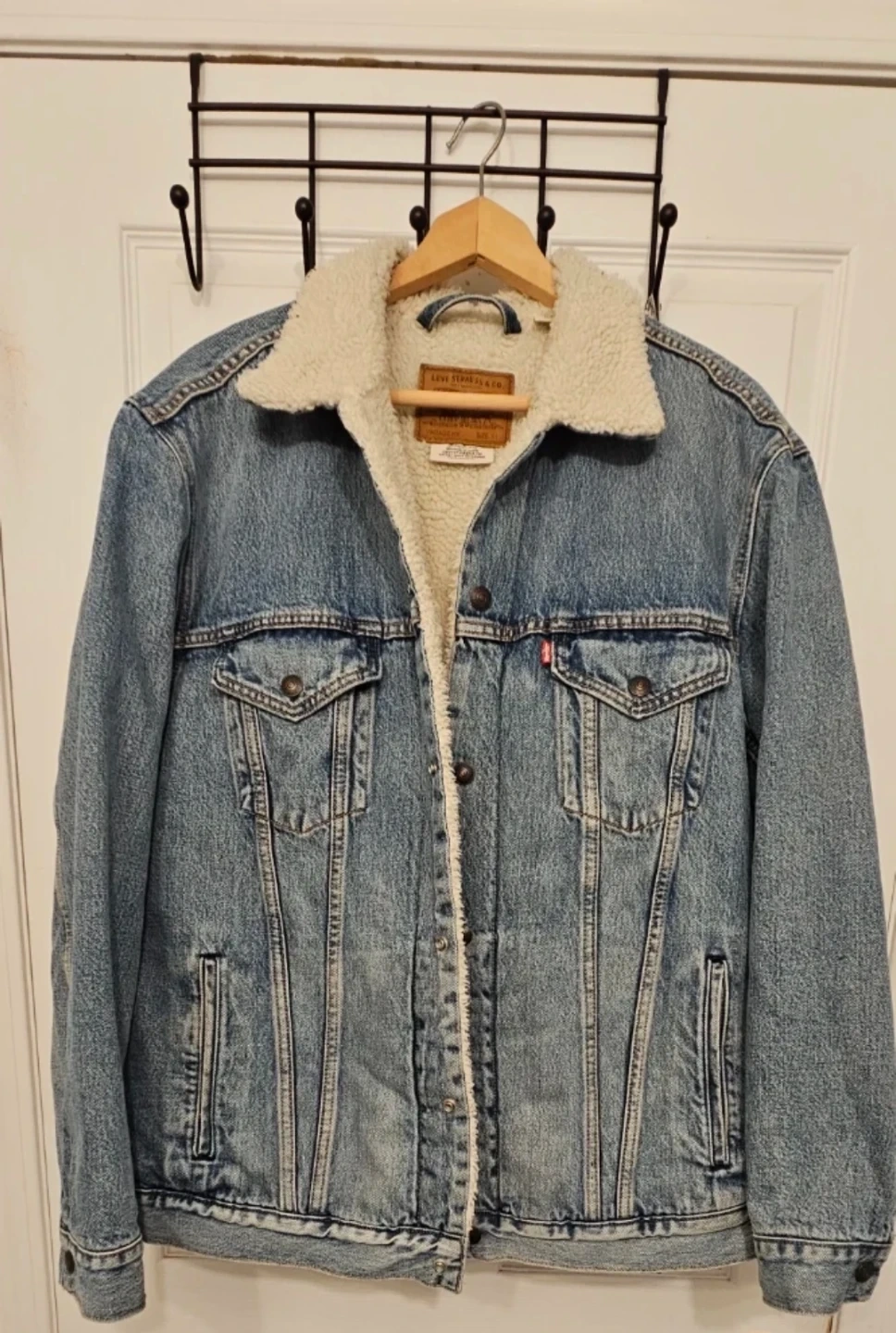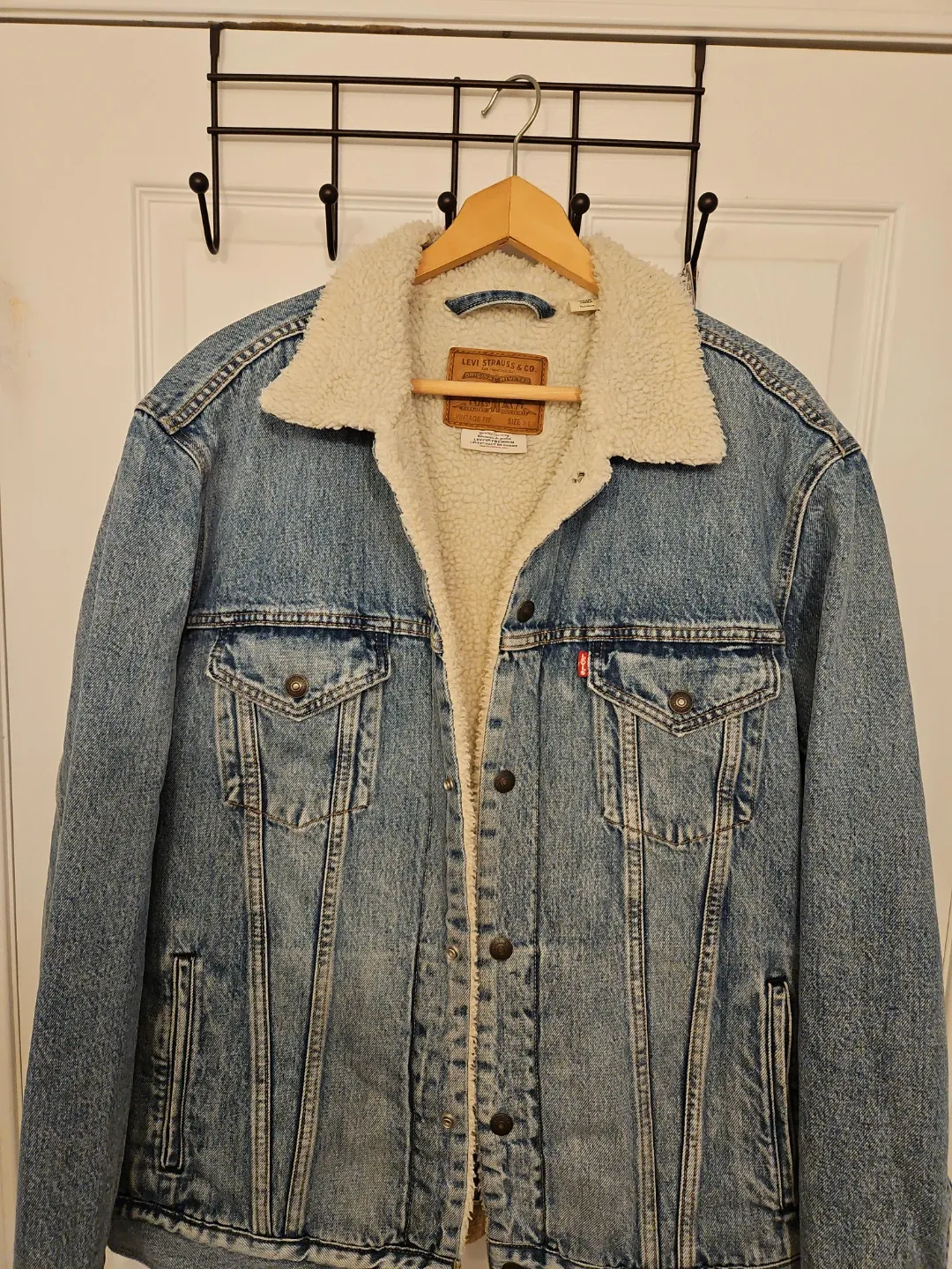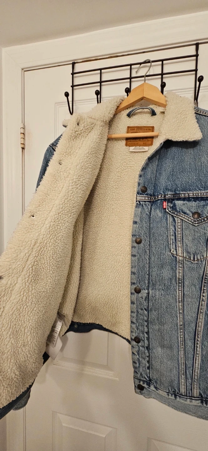 A classic Levi's denim jacket with a warm sherpa lining. It features a vintage fit and is size XL. Perfect for staying warm and stylish during cooler weather!
