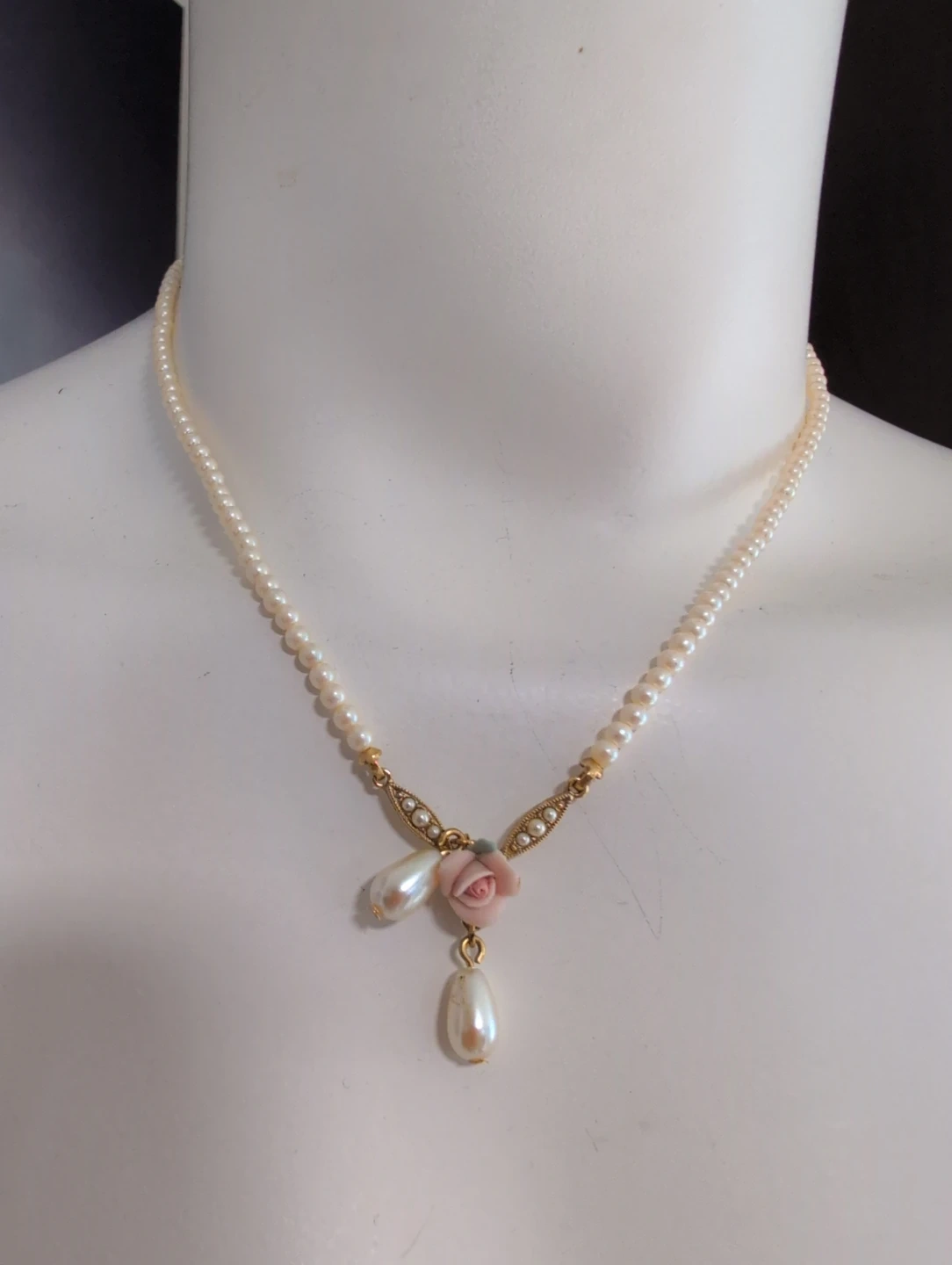 This is a delicate pearl necklace featuring a charming rose pendant and faux pearl drops. It has a gold-tone chain with an adjustable clasp for a comfortable fit. A lovely piece for any occasion!