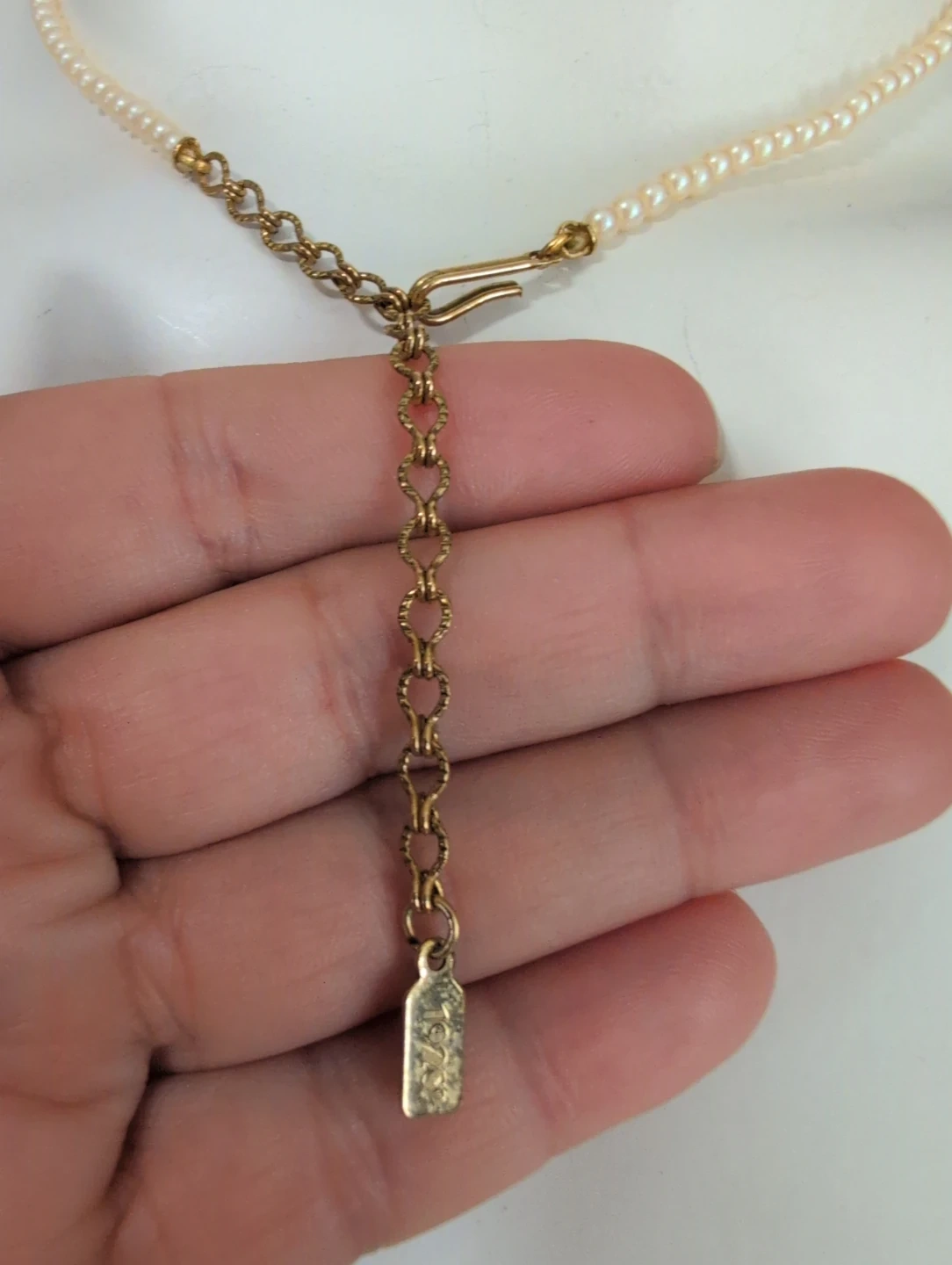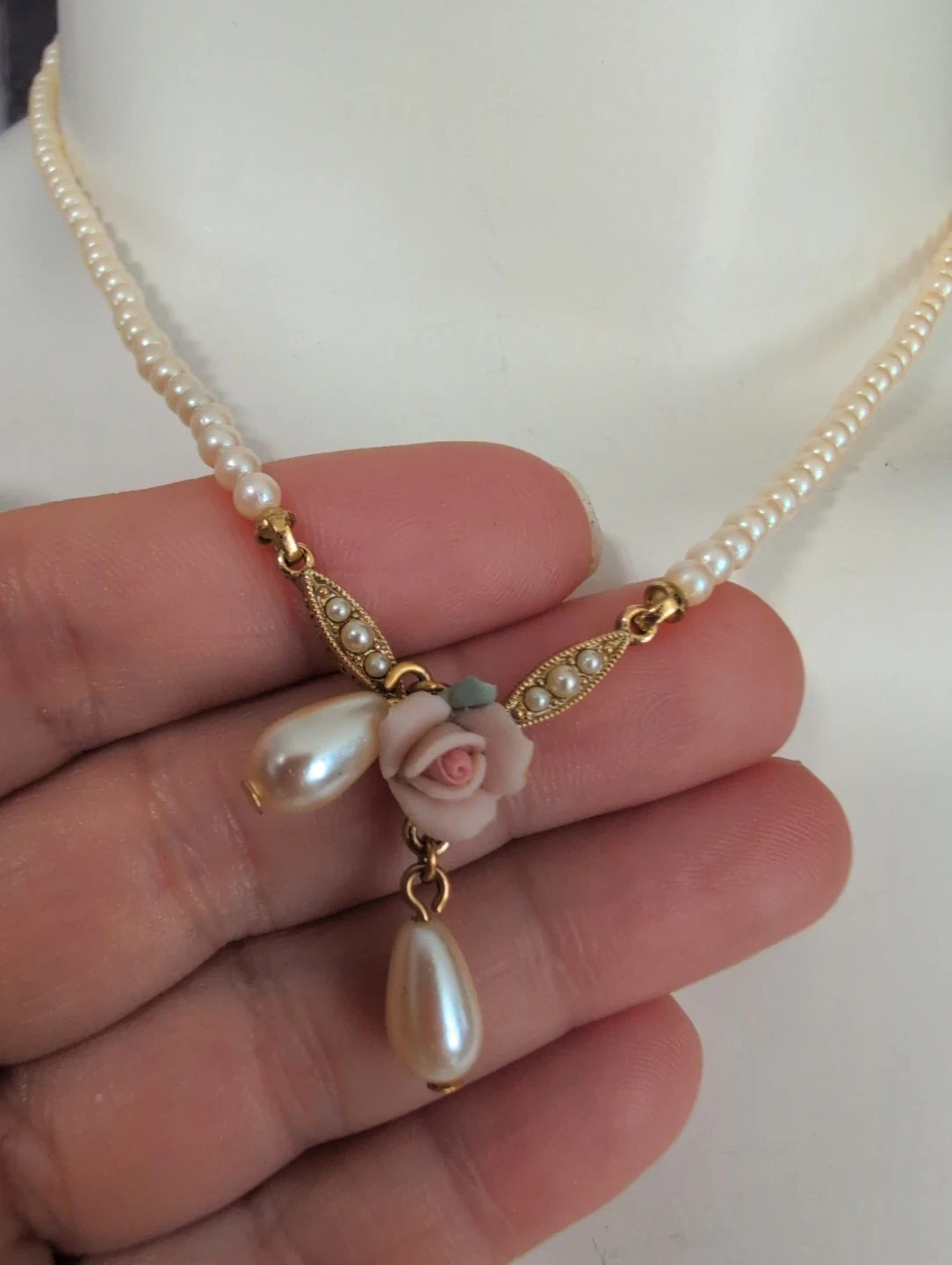 This is a delicate pearl necklace featuring a charming rose pendant and faux pearl drops. It has a gold-tone chain with an adjustable clasp for a comfortable fit. A lovely piece for any occasion!