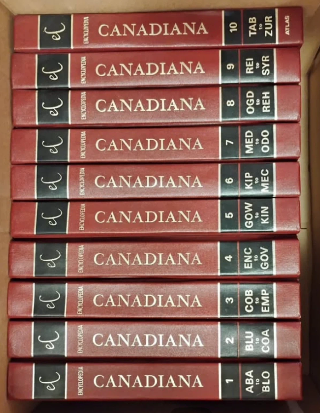A complete 10-volume set of the Canadiana Encyclopedia. These volumes cover topics from ABA to ZUR and include an Atlas. They're bound in a classic red hardcover. A great reference for Canadian history and culture!