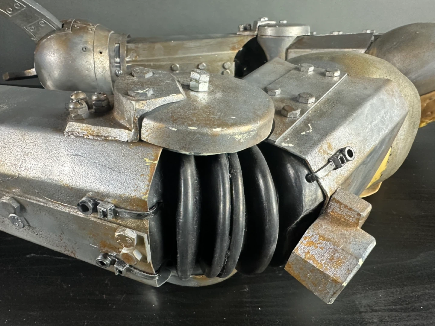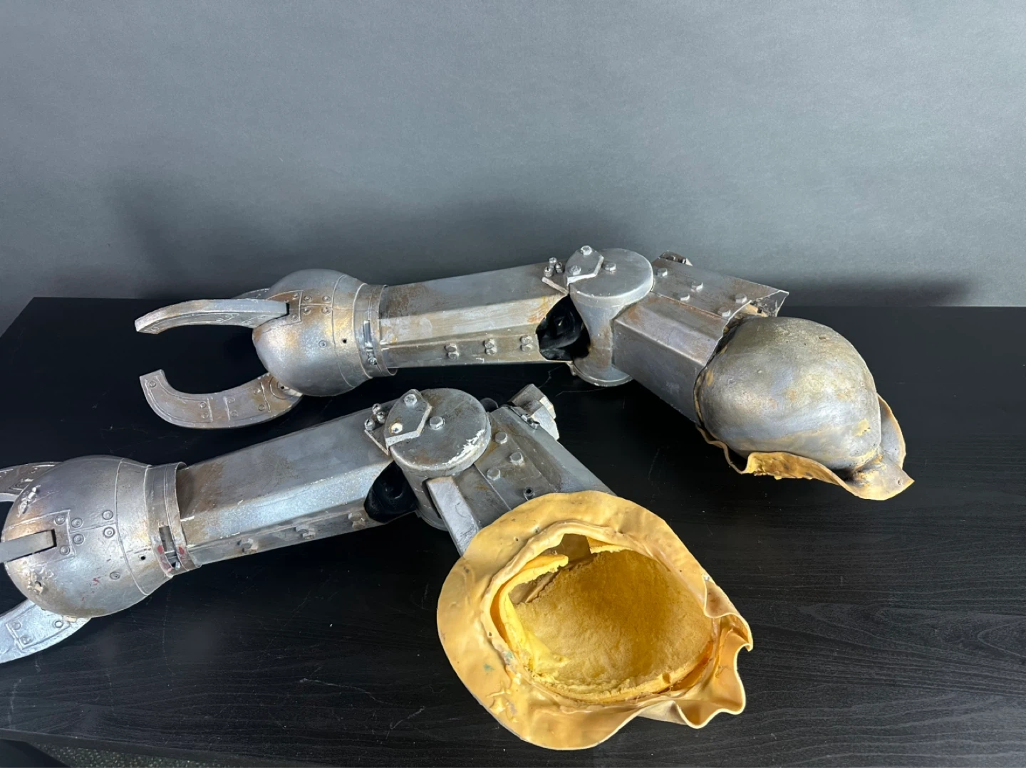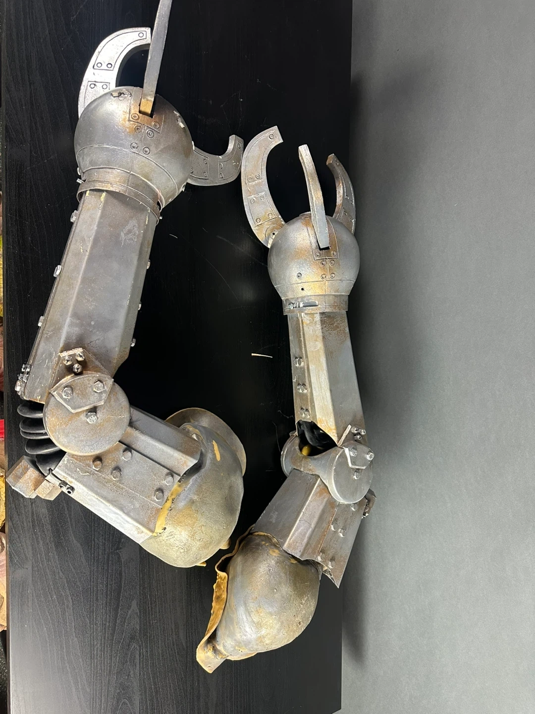 A pair of metallic robotic arms with a weathered, industrial look. They feature articulated joints and claw-like end effectors. Great for display or as a unique prop!