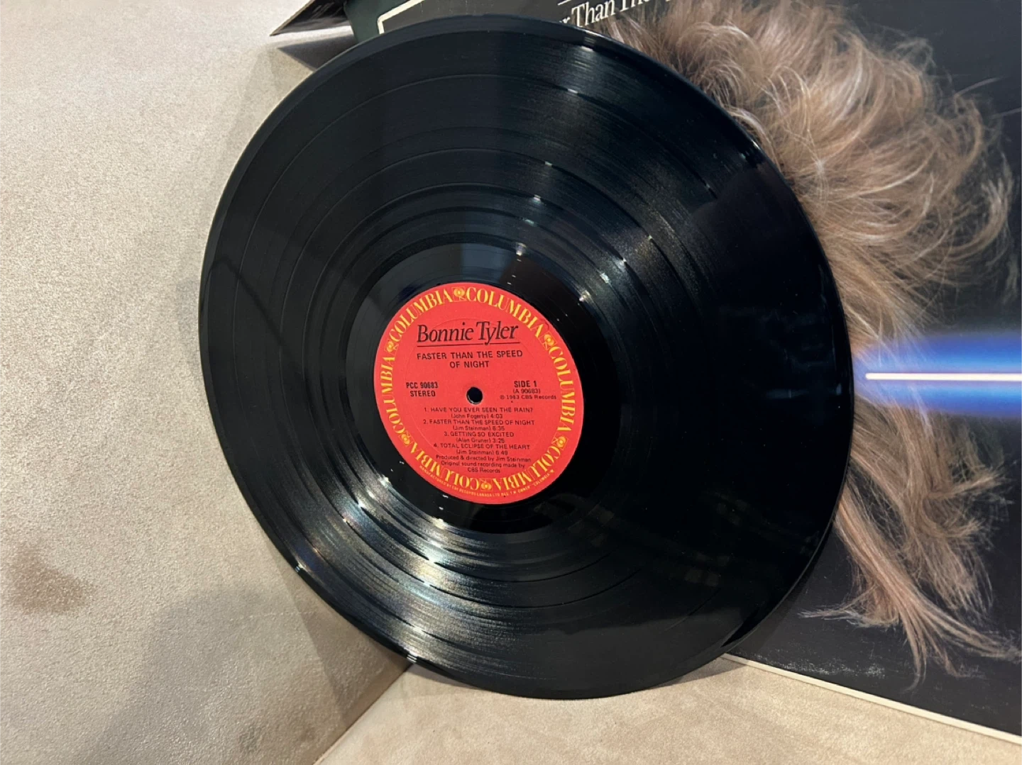This is Bonnie Tyler's 'Faster Than The Speed Of Night' vinyl record. It features her hit songs, including 'Total Eclipse of the Heart'. A must-have for fans of 80s music!