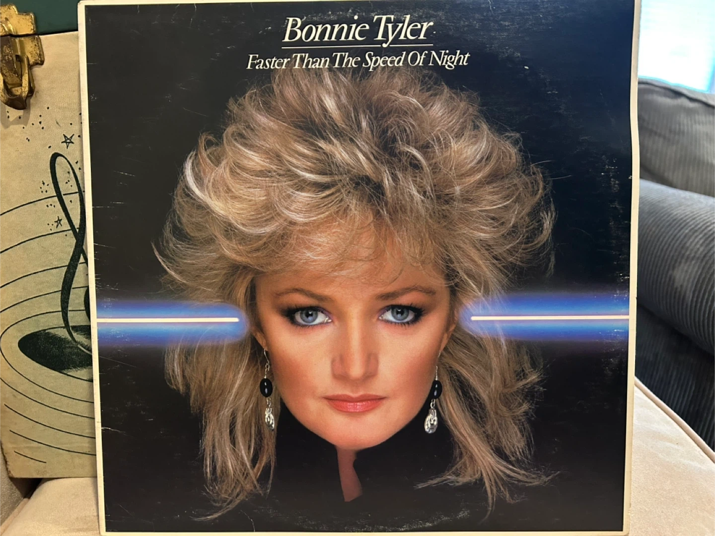 This is Bonnie Tyler's 'Faster Than The Speed Of Night' vinyl record. It features her hit songs, including 'Total Eclipse of the Heart'. A must-have for fans of 80s music!