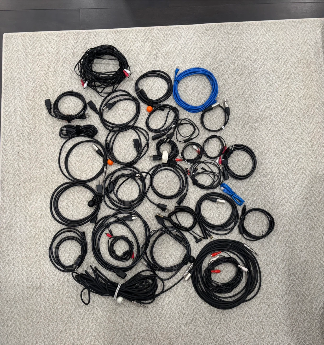A bundle of various audio and video cables. Includes RCA, USB, and possibly other connector types. These are essential for connecting different electronic devices. Great for anyone with an audio or video setup like setting up a home studio, church, school, or community space.