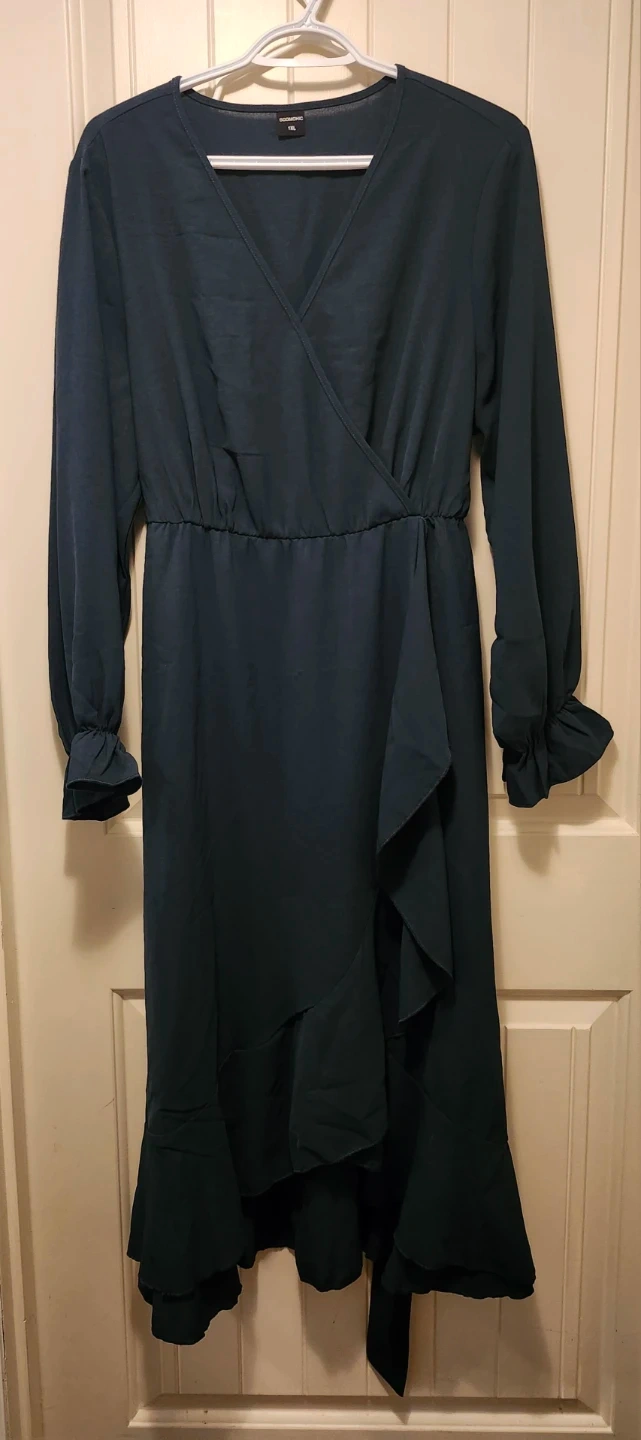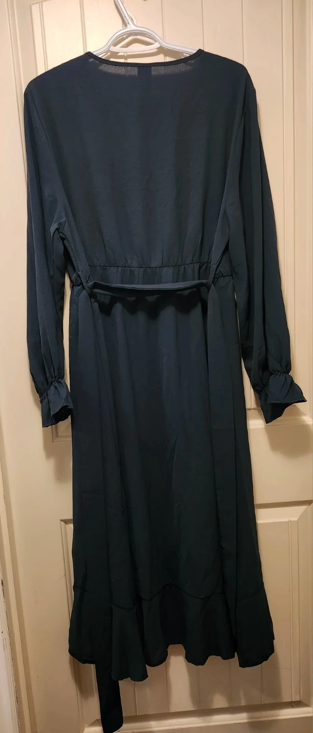 This Scomchic wrap dress is a size 1XL and features a beautiful green colour. It has long sleeves with ruffled cuffs and a ruffled hemline. The dress is made from a silky material and includes a tie belt for a customizable fit.