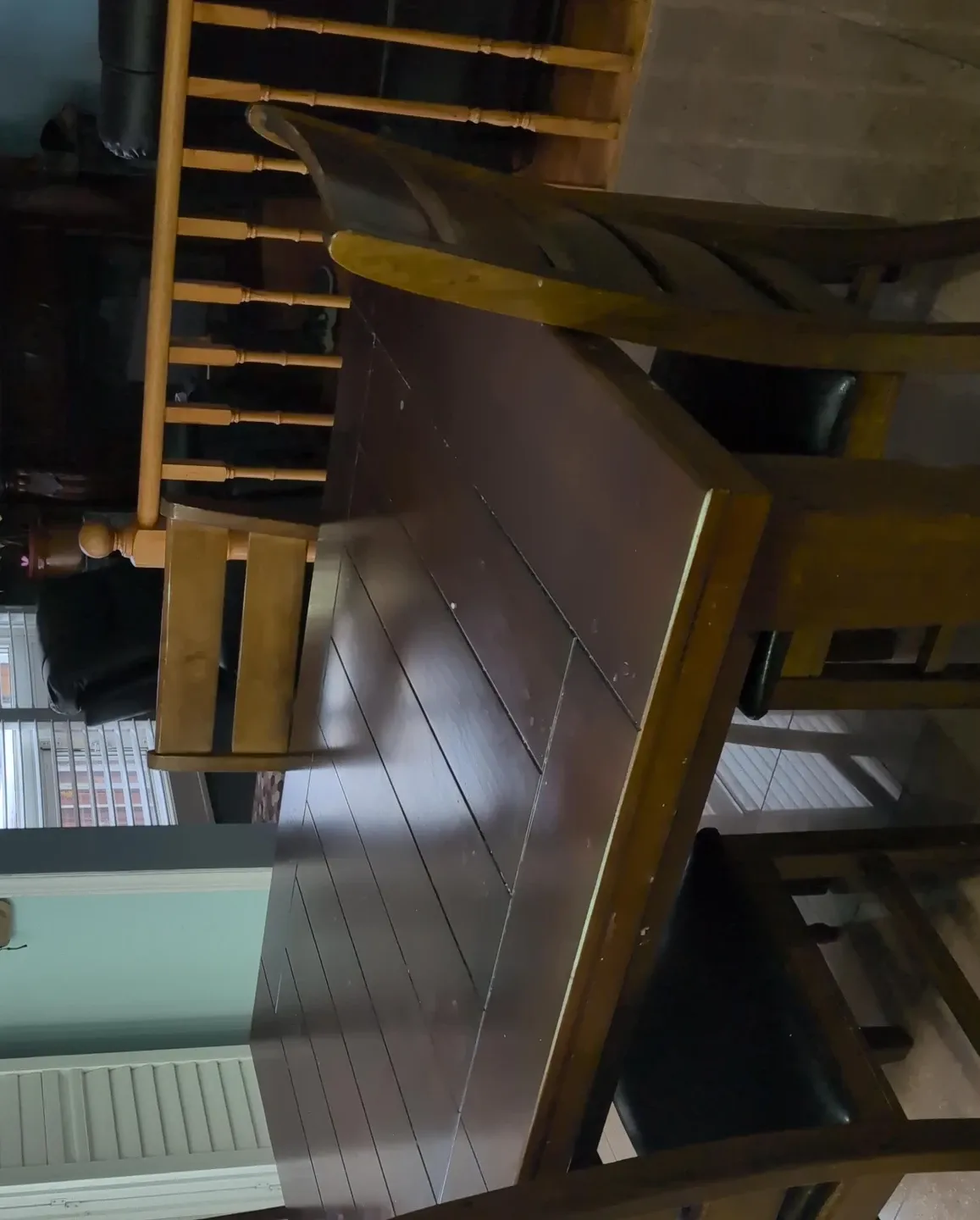 This is a dark wood dining table with matching chairs. The set includes the table and four chairs with black upholstered seats. It's a solid wood set, perfect for everyday meals.